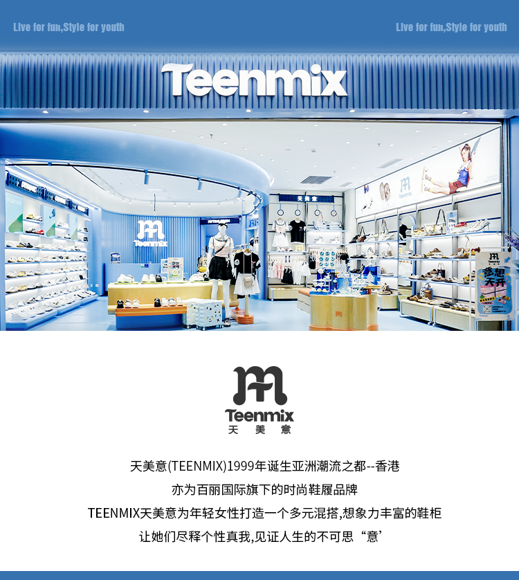 Teenmix(天美意),作为一个都市时尚休闲品牌,倡导“life for fun ,style for teens”即 “人生追求情趣,年轻追求个性”的生活品位,迎合都市年轻人不拘一格,追求mix&match自由组合,创出自我风格的潮流理念。Teenmix向人们展示了流行的转变,强调创意与个性,“teen”代表一群张扬个性、散发活力、追求都市炫彩生活的新新人群;“ mix”即mix&match,代表时尚混搭精神,品牌为年轻人提供恍如贴身订造的时尚潮品,并因应时尚的转变而响应。“随我意,天美意”传达了品牌的主张与个性。