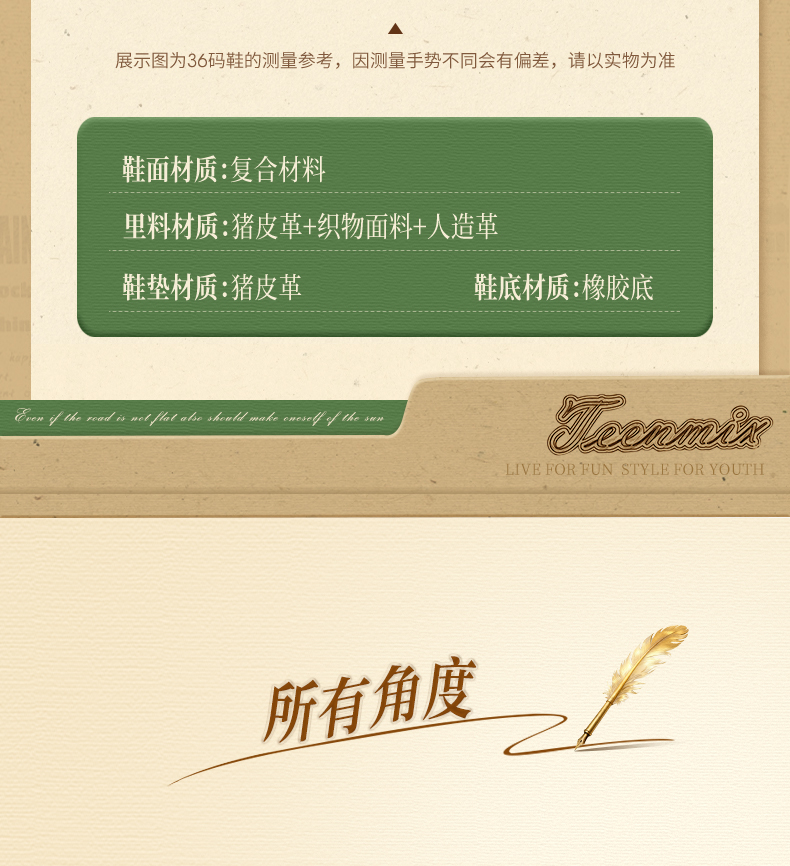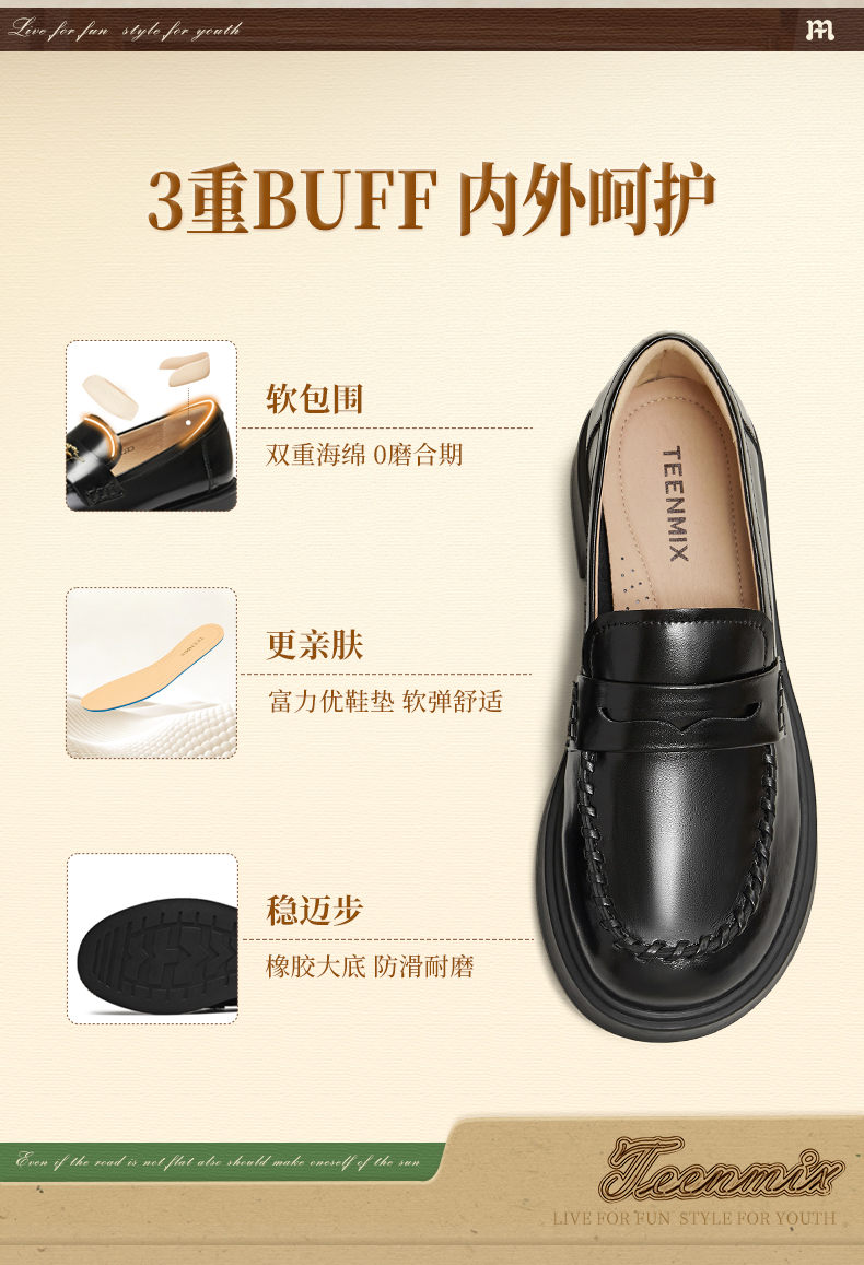 Teenmix(天美意),作为一个都市时尚休闲品牌,倡导“life for fun ,style for teens”即 “人生追求情趣,年轻追求个性”的生活品位,迎合都市年轻人不拘一格,追求mix&match自由组合,创出自我风格的潮流理念。Teenmix向人们展示了流行的转变,强调创意与个性,“teen”代表一群张扬个性、散发活力、追求都市炫彩生活的新新人群;“ mix”即mix&match,代表时尚混搭精神,品牌为年轻人提供恍如贴身订造的时尚潮品,并因应时尚的转变而响应。“随我意,天美意”传达了品牌的主张与个性。