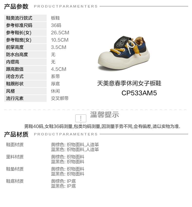 | 鞋垫材质:织物面料 | 款式季节:秋季 | 前掌高度:3.5CM | 皮质特征:织物 | 防水台高度:无 |