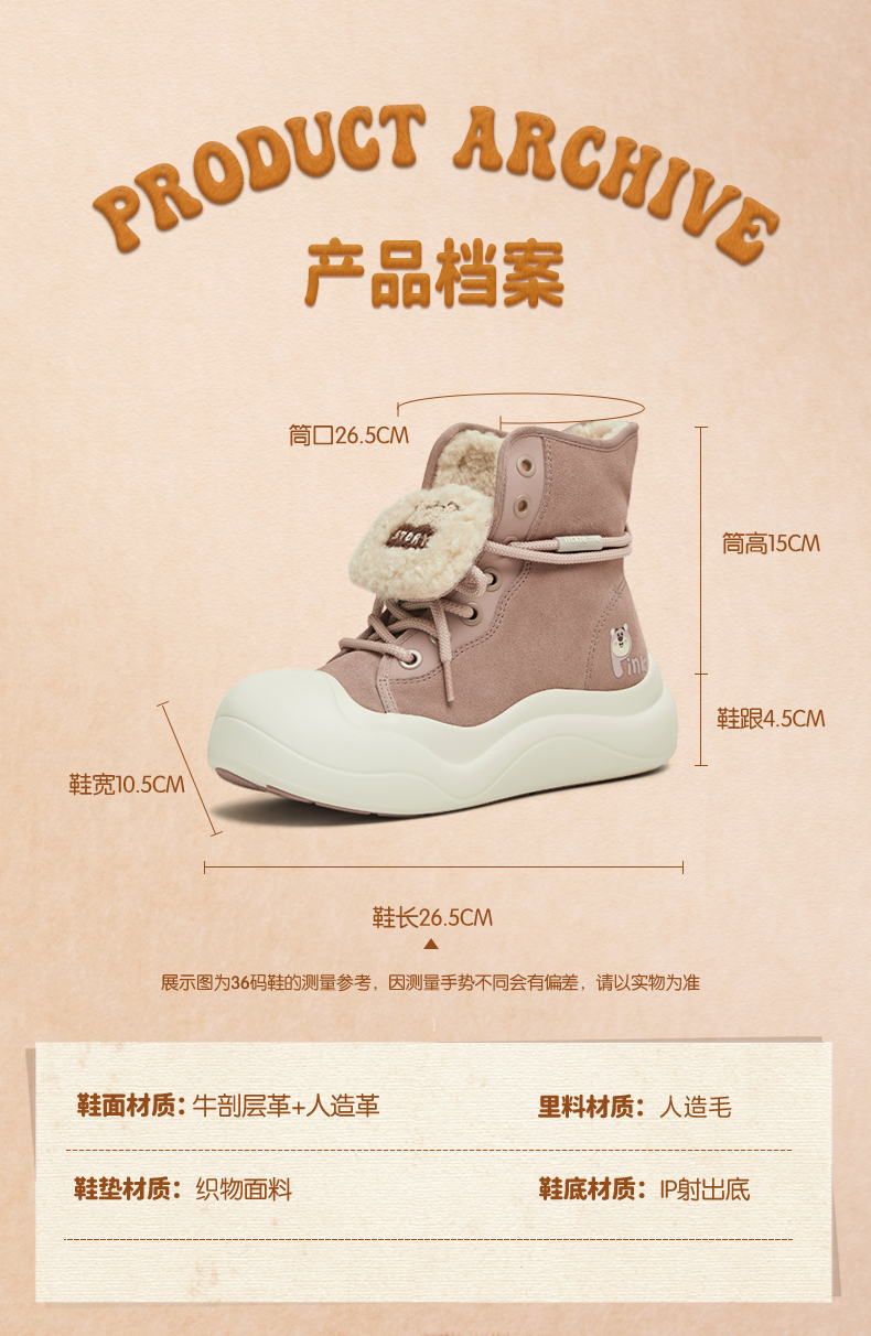 | 配跟:无 | 靴筒口围:26.5CM | 上市时间:2025年冬季 | 鞋类流行款式:雪地靴 | 鞋头款式:圆头 |
