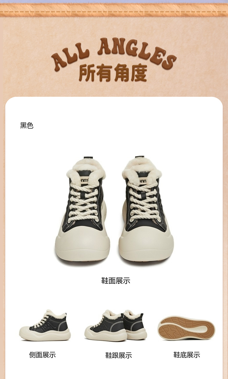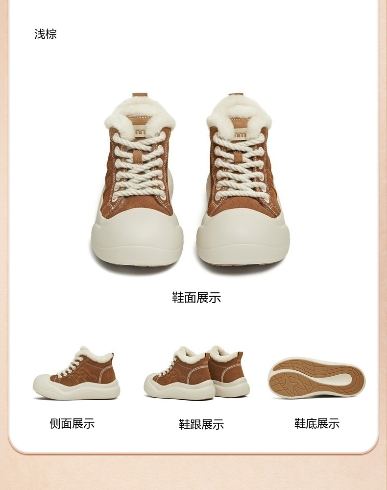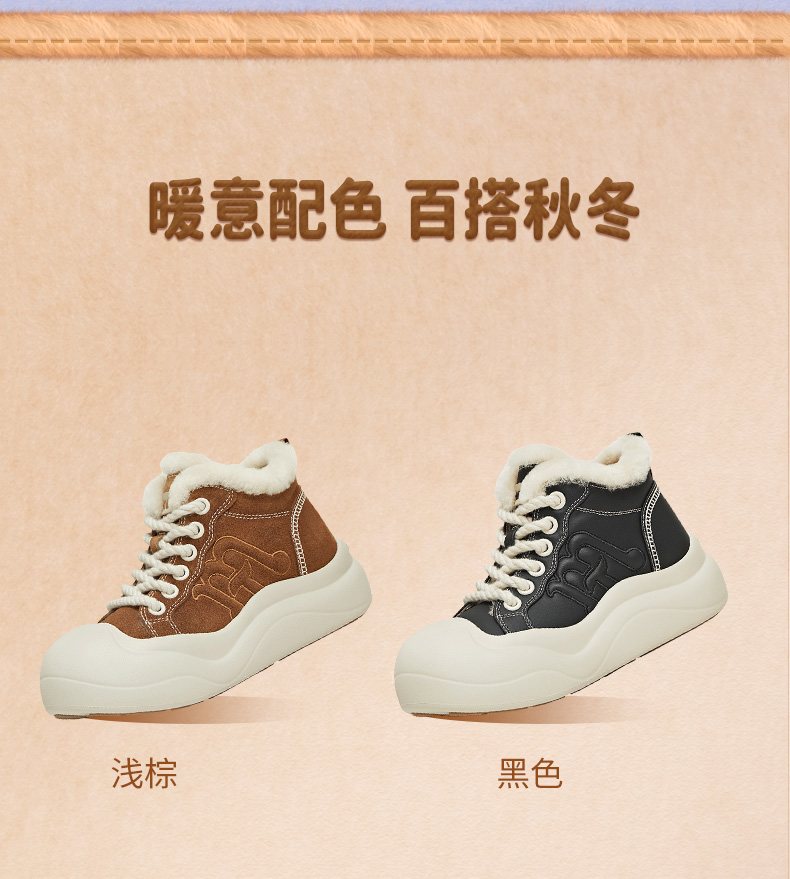 | 鞋底材质:IP射出底 | 靴筒内里材质:人造短毛绒 | 内增高:无 | 鞋面材质:织物牛剖层革 | 闭合方式:系带 |