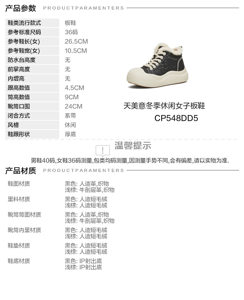 | 款式季节:冬季 | 前掌高度:无 | 皮质特征:人造革 | 防水台高度:无 |