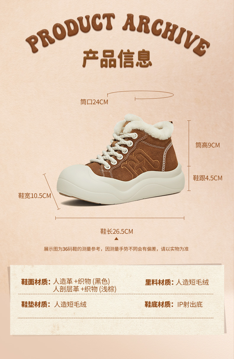 | 帮面材质:人造革织物 | 配跟:无 | 靴筒口围:24CM | 上市时间:2025年冬季 | 鞋类流行款式:板鞋 |