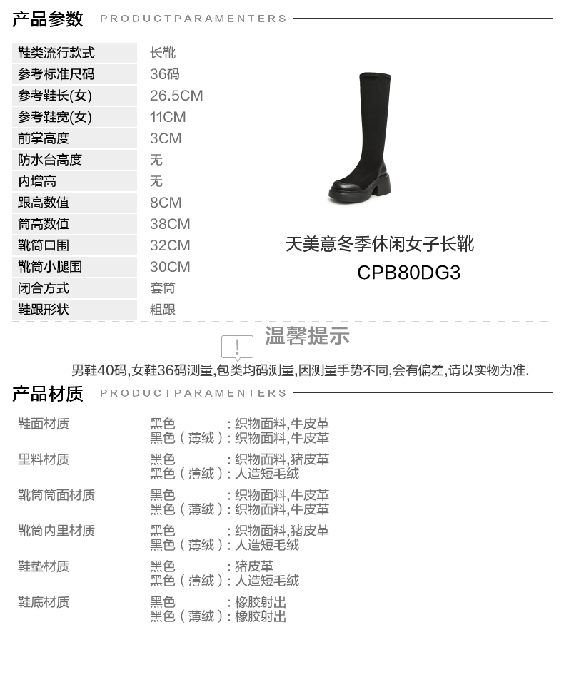 | 风格:休闲 | 色系:黑色 | 跟高数值:8CM | 性别:女子 | 筒高数值:38CM |
