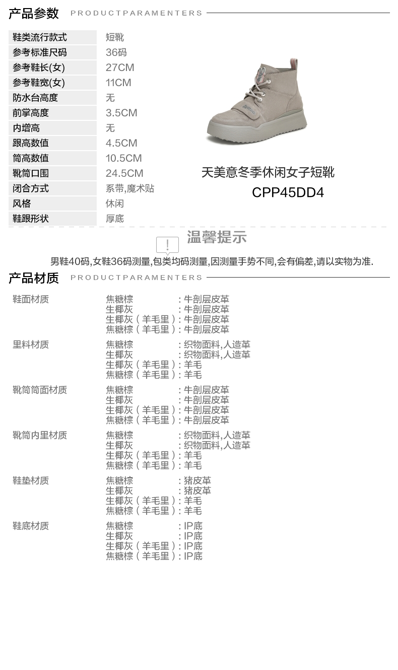 | 前掌高度:3.5CM | 皮质特征:二层皮 | 防水台高度:无 | 销售季:2024年冬季 |