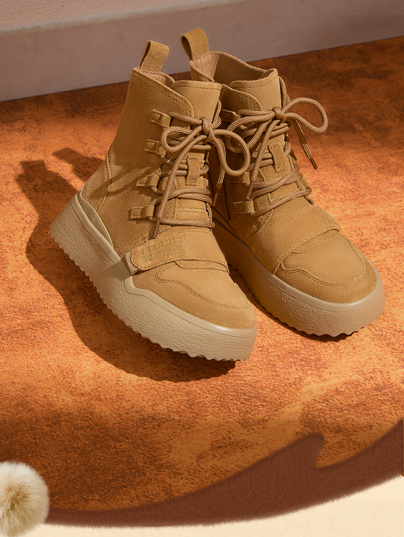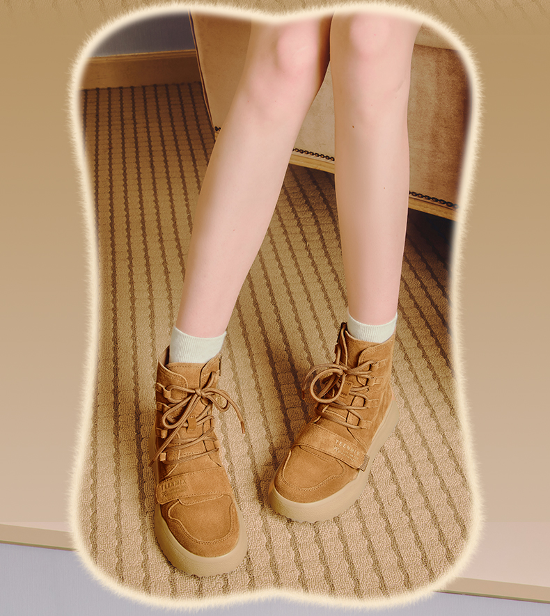 鞋底材质:IP底 靴筒内里材质:猪皮革人造短毛绒 内增高:无 鞋面材质:牛剖层皮革 闭合方式:系带