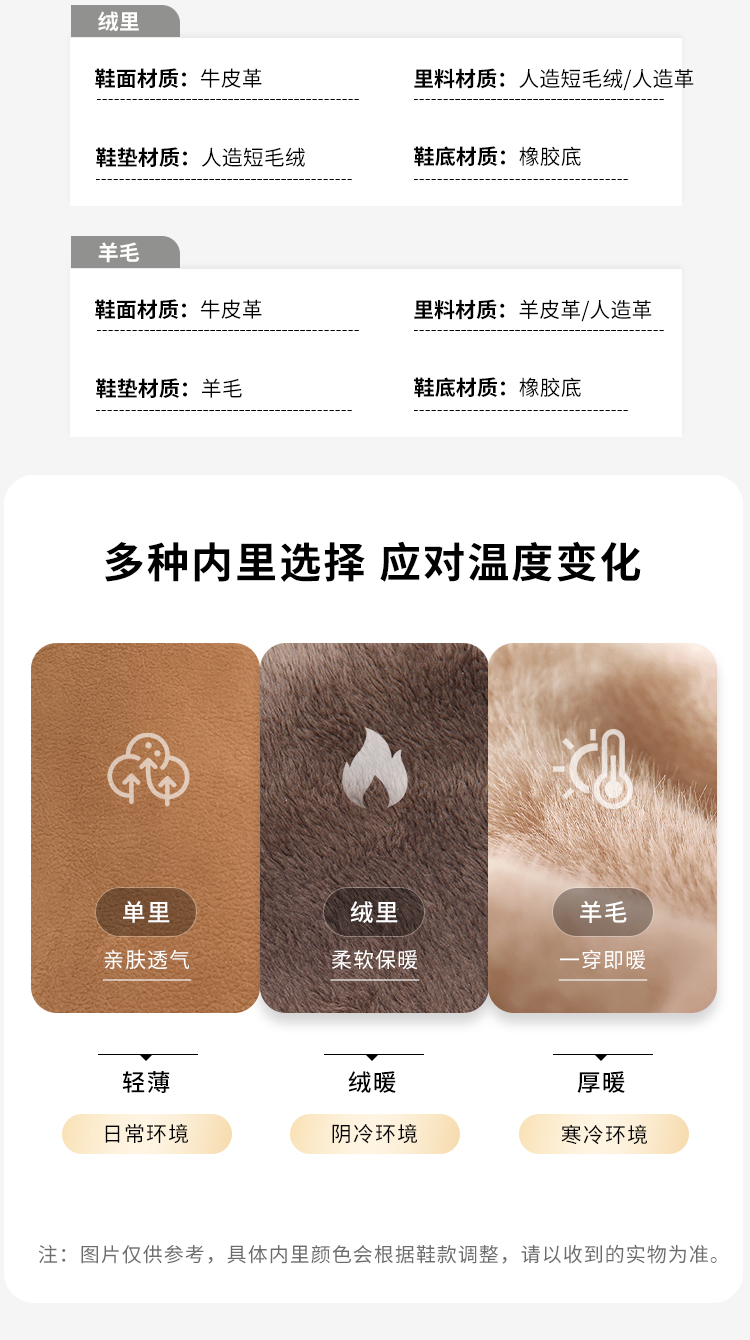 | 里料材质:织物面料人造革 | 制鞋工艺:胶贴皮鞋 | 款式季节:冬季 | 鞋垫材质:猪皮革 | 渠道划分:线下同步 |