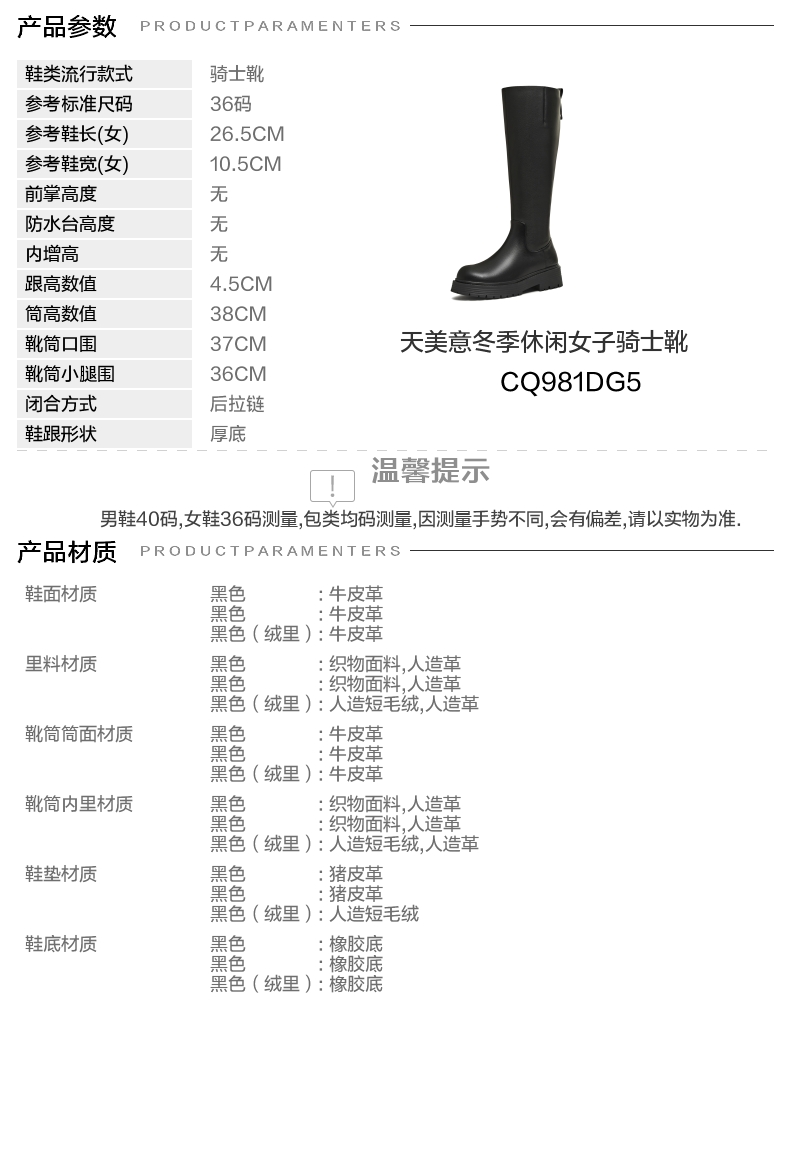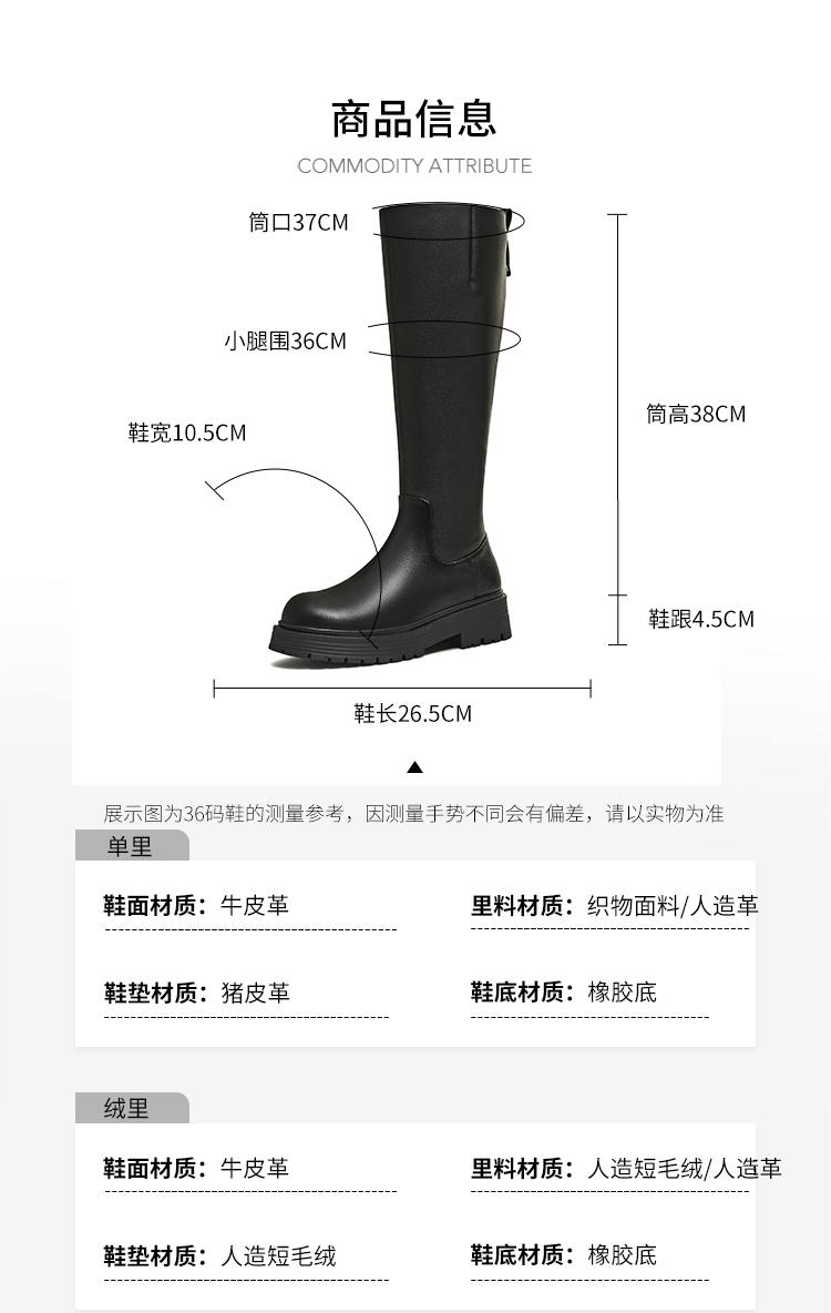 | 靴筒筒面材质:牛皮革 | 靴筒小腿围:36CM | 里料材质:人造革人造短毛绒 | 制鞋工艺:胶贴皮鞋 | 鞋垫材质:人造短毛绒 |
