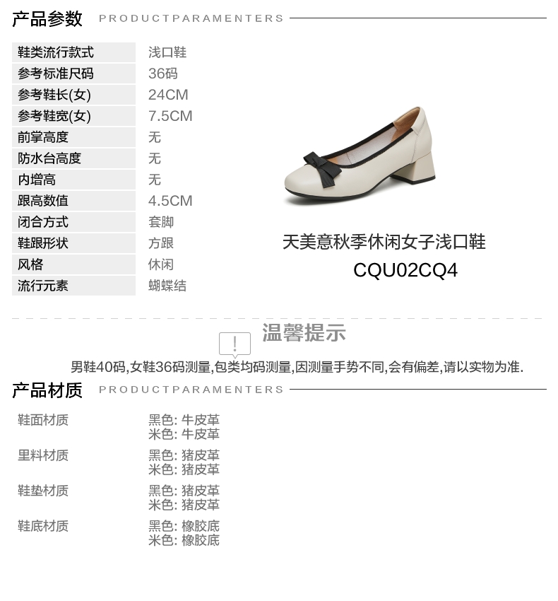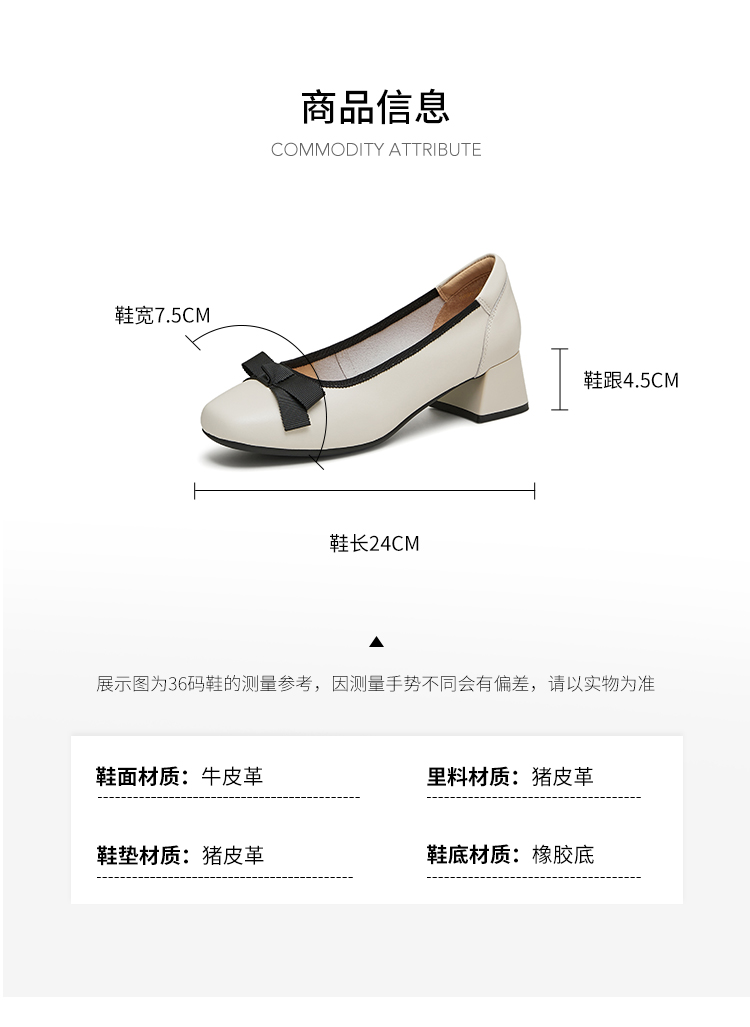 | 上市时间:2024年秋季 | 鞋类流行款式:浅口鞋 | 鞋头款式:圆头 | 跟高范围:中跟鞋(3-5CM) | 鞋面图案:纯色 |
