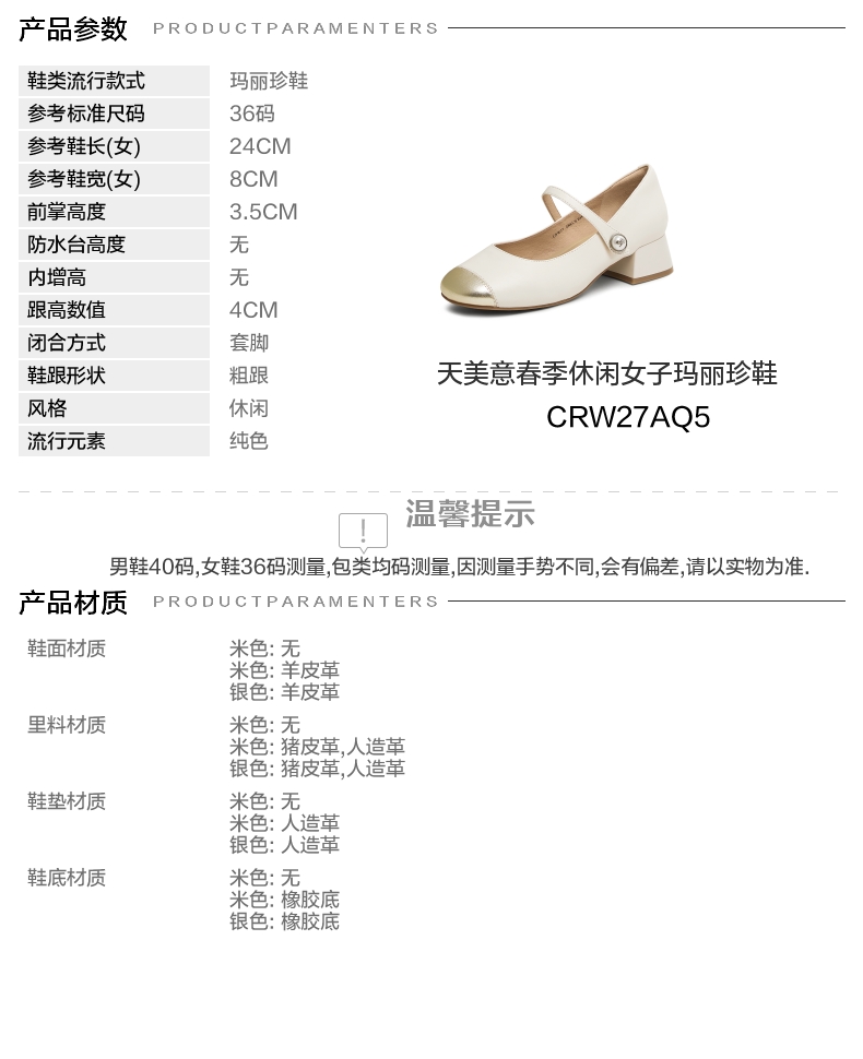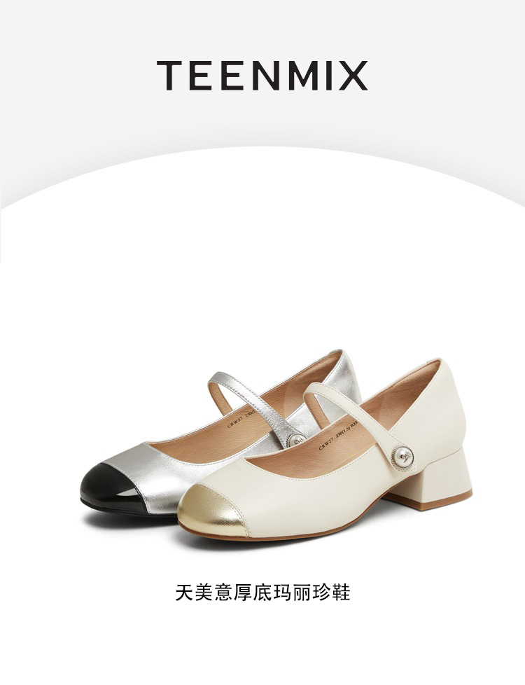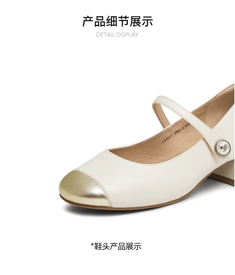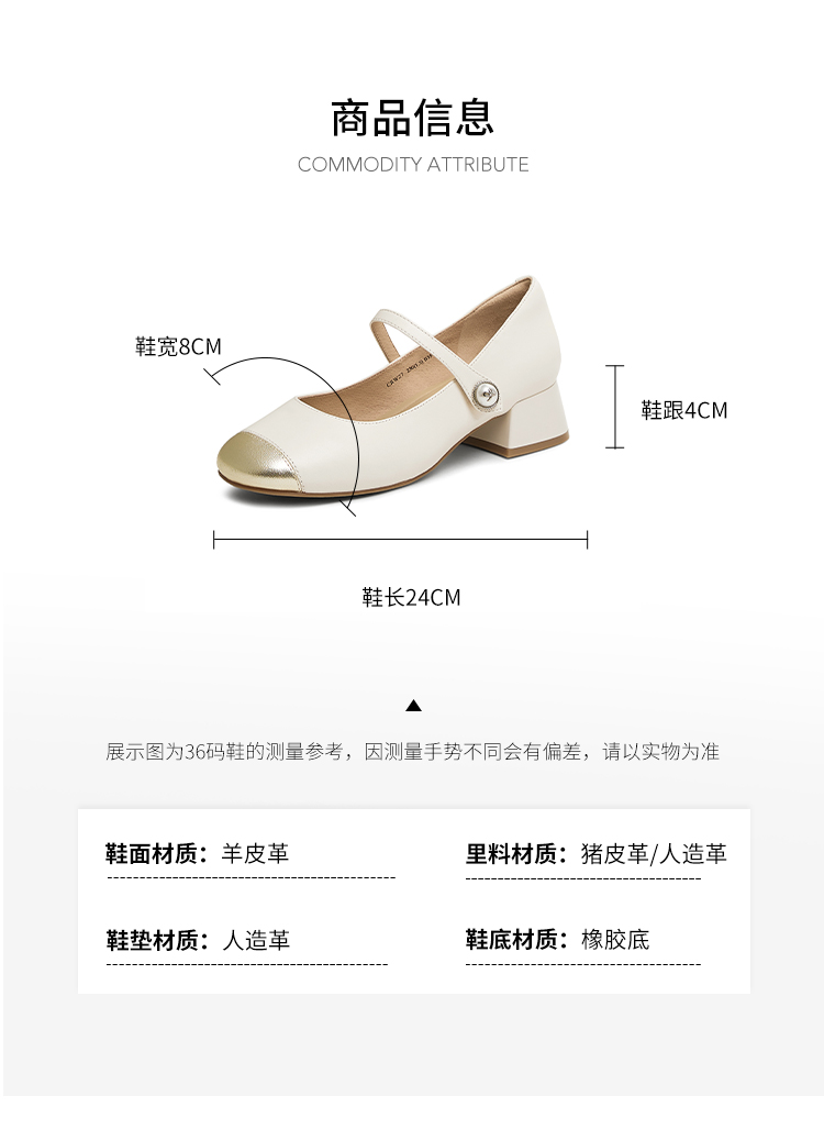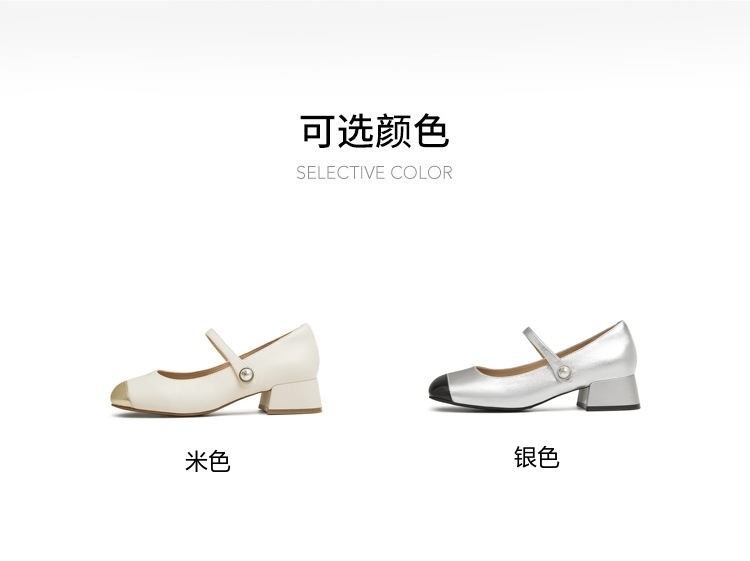 | 上市时间:2025年春季 | 鞋类流行款式:玛丽珍鞋 | 鞋头款式:圆头 | 跟高范围:中跟鞋(3-5CM) | 鞋面图案:纯色 |
