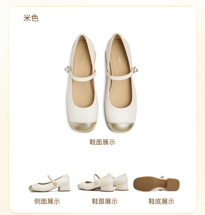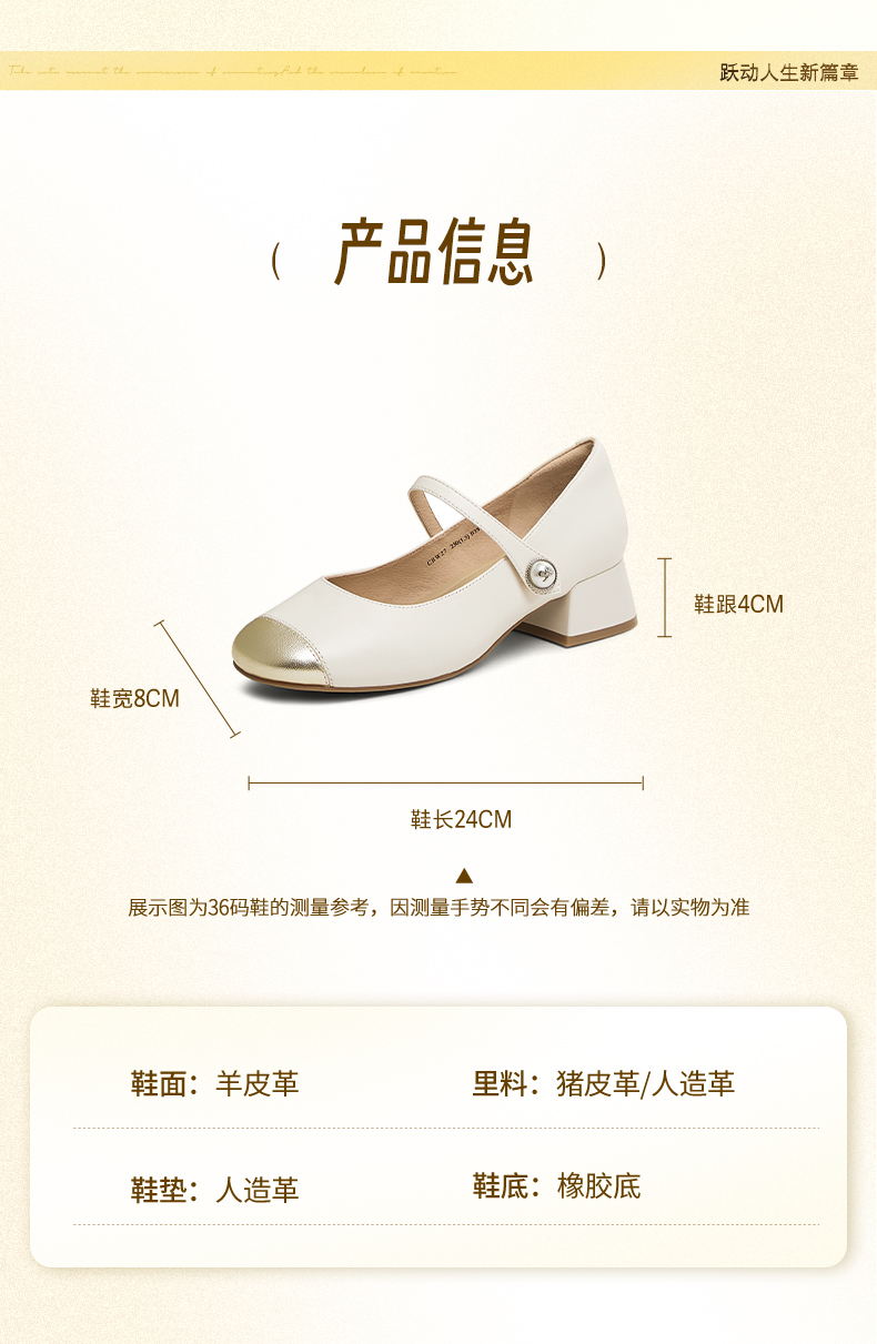 | 上市时间:2025年春季 | 鞋类流行款式:玛丽珍鞋 | 鞋头款式:圆头 | 跟高范围:中跟鞋(3-5CM) | 鞋面图案:纯色 |