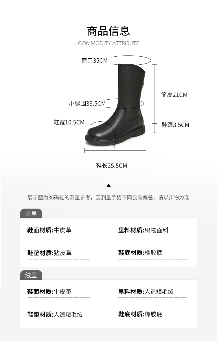 | 靴筒筒面材质:牛皮革 | 靴筒小腿围:33.5CM | 里料材质:织物面料 | 制鞋工艺:胶贴皮鞋 | 鞋垫材质:猪皮革 |
