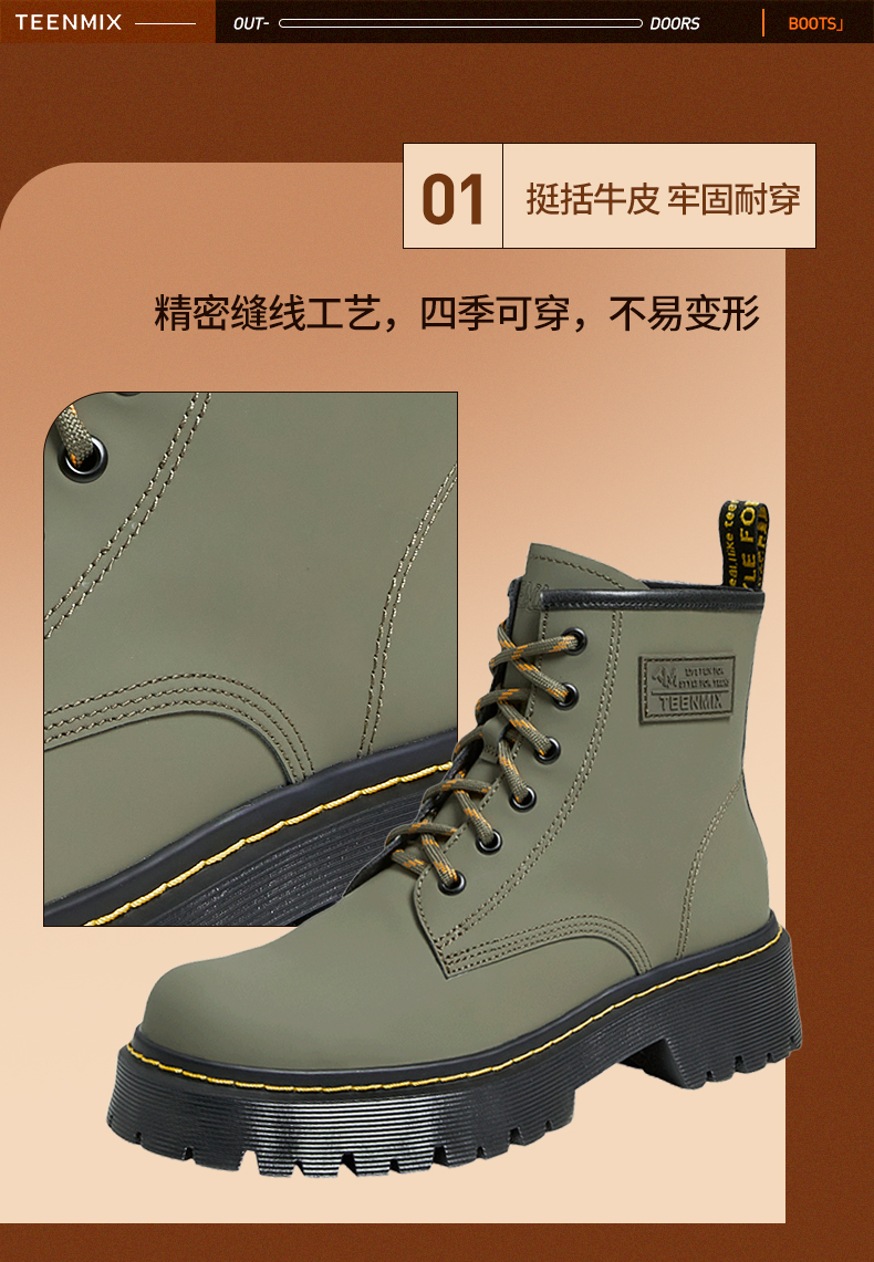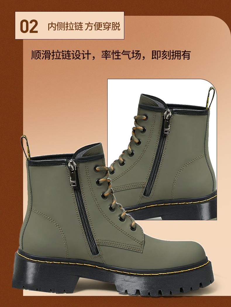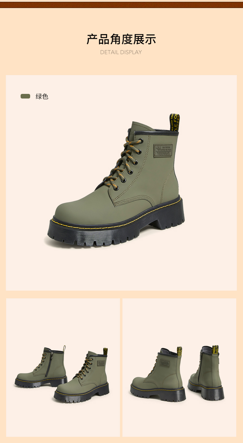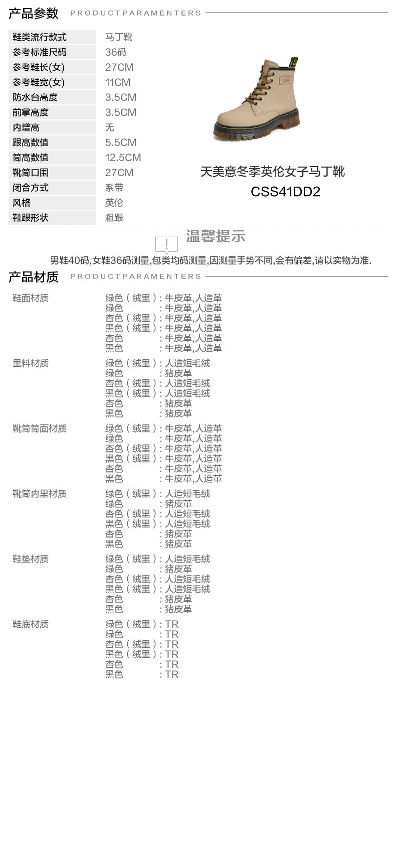 | 鞋底材质:TR | 靴筒内里材质:猪皮革 | 内增高:无 | 鞋面材质:牛皮革人造革牛皮革 | 闭合方式:系带 |