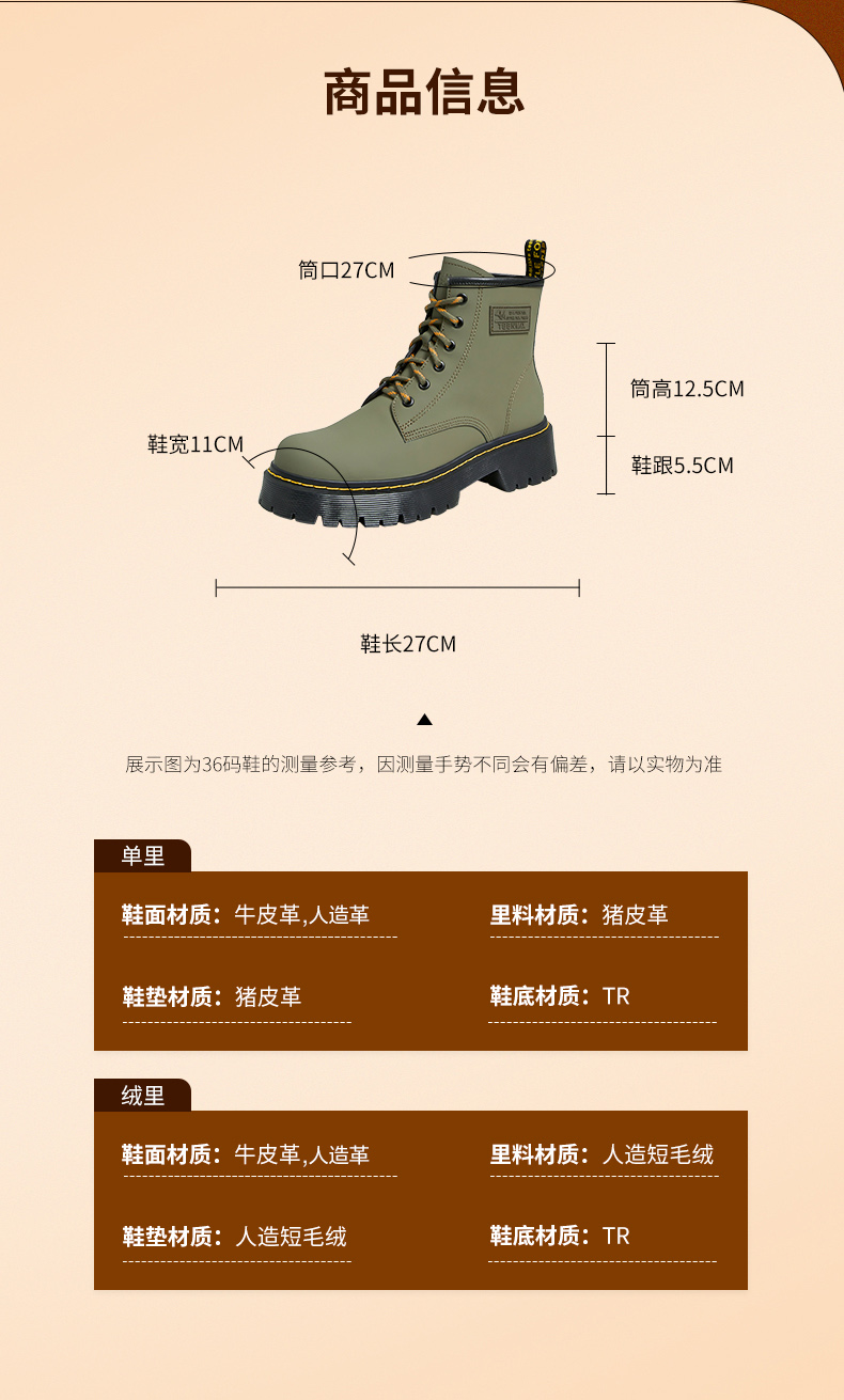 | 帮面材质:头层牛皮 | 靴筒口围:27CM | 上市时间:2022年冬季 | 鞋类流行款式:马丁靴 | 鞋头款式:圆头 |