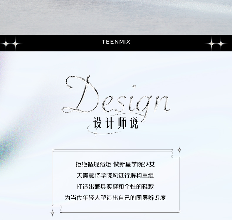 Teenmix(天美意),作为一个都市时尚休闲品牌,倡导“life for fun ,style for teens”即 “人生追求情趣,年轻追求个性”的生活品位,迎合都市年轻人不拘一格,追求mix&match自由组合,创出自我风格的潮流理念。Teenmix向人们展示了流行的转变,强调创意与个性,“teen”代表一群张扬个性、散发活力、追求都市炫彩生活的新新人群;“ mix”即mix&match,代表时尚混搭精神,品牌为年轻人提供恍如贴身订造的时尚潮品,并因应时尚的转变而响应。“随我意,天美意”传达了品牌的主张与个性。