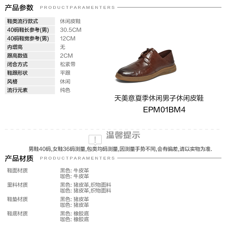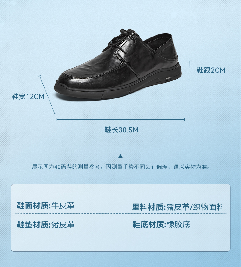| 鞋面材质:牛皮革 | 适用场合:日常休闲 | 闭合方式:松紧带 | 所在区域:电子商务 | 40码鞋宽参考(男):12CM |