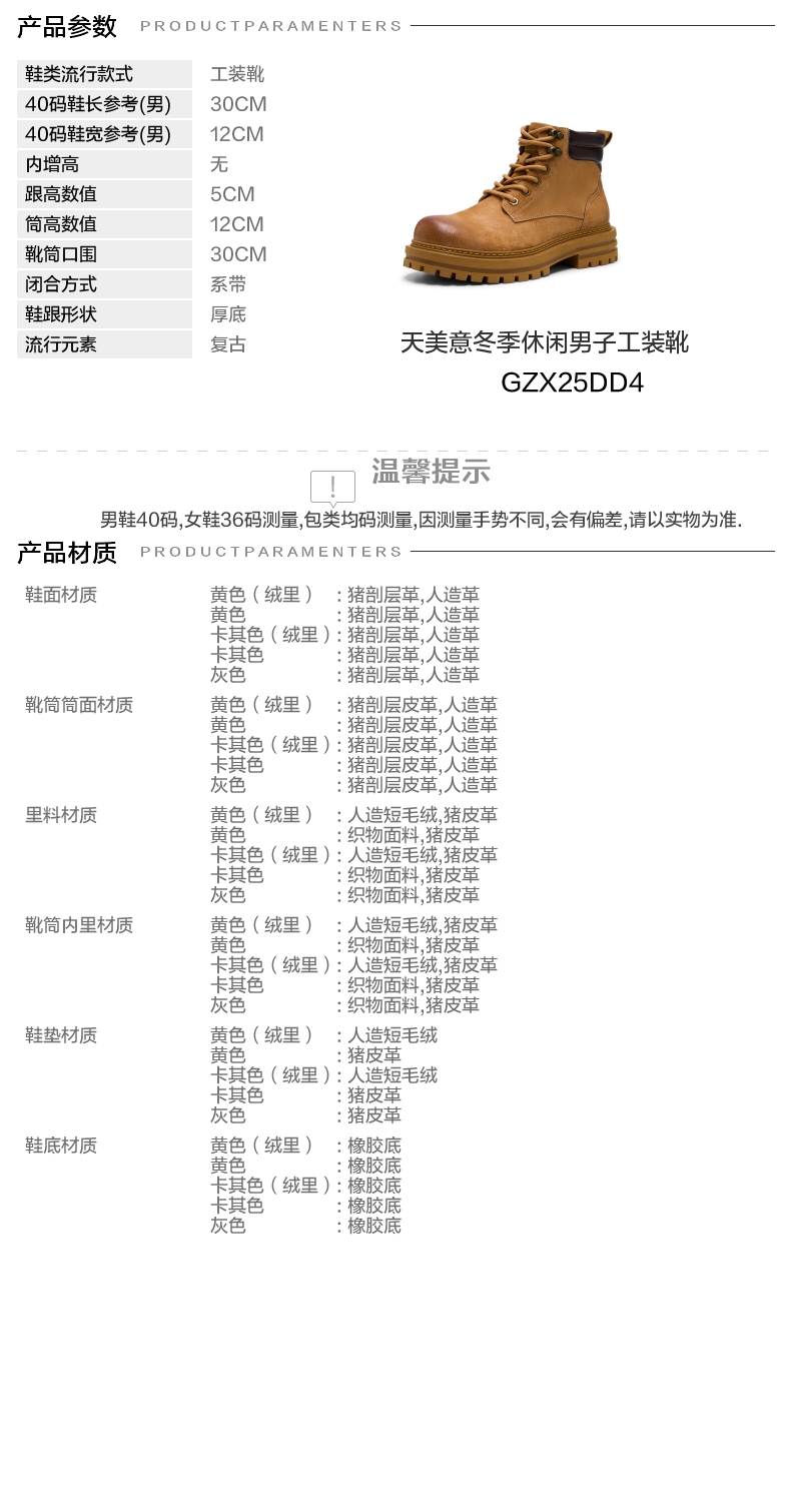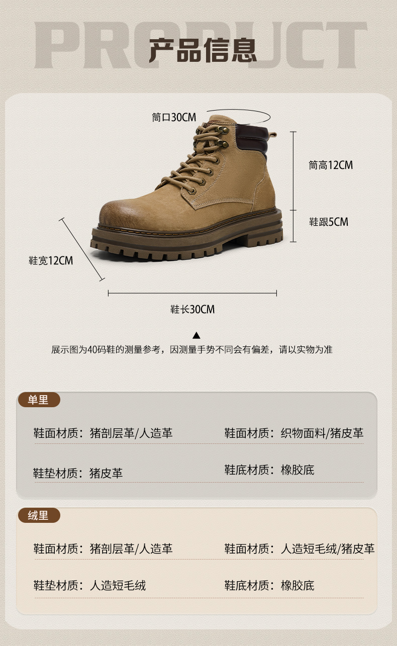 | 闭合方式:系带 | 40码鞋宽参考(男):12CM | 靴筒口围:30CM | 上市时间:2024年冬季 | 鞋类流行款式:工装靴 |