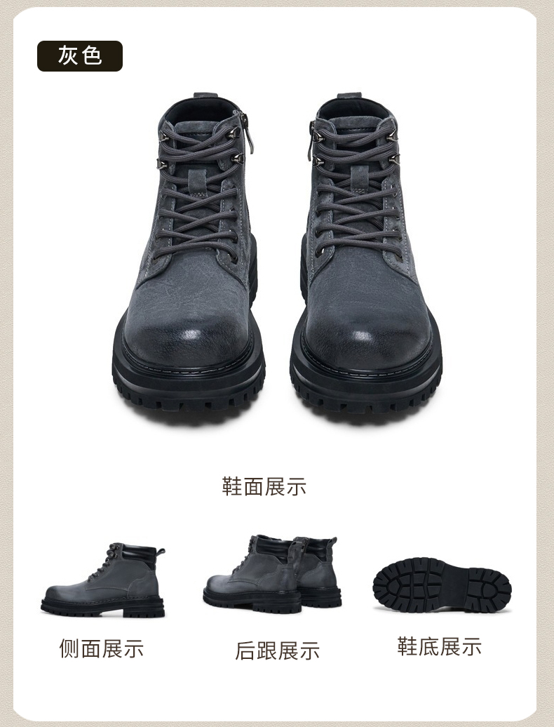 | 跟高数值:5CM | 色系:灰色 | 性别:男子 | 筒高数值:12CM | 靴筒筒面材质:人造革猪剖层皮革 |