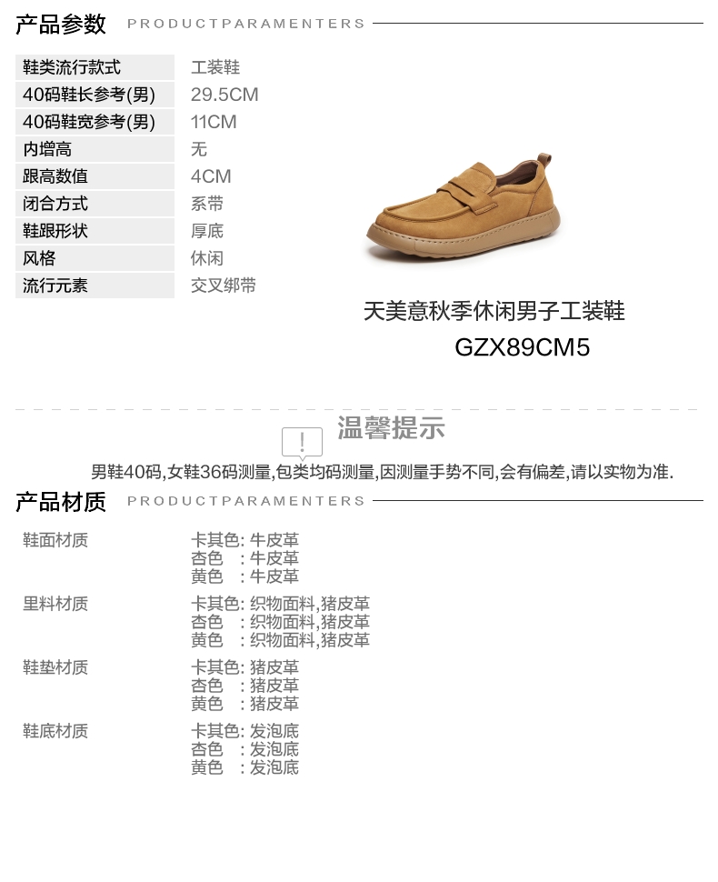 | 风格:休闲 | 色系:米黄色 | 跟高数值:4CM | 40码鞋宽参考(男):11CM | 性别:男子 |