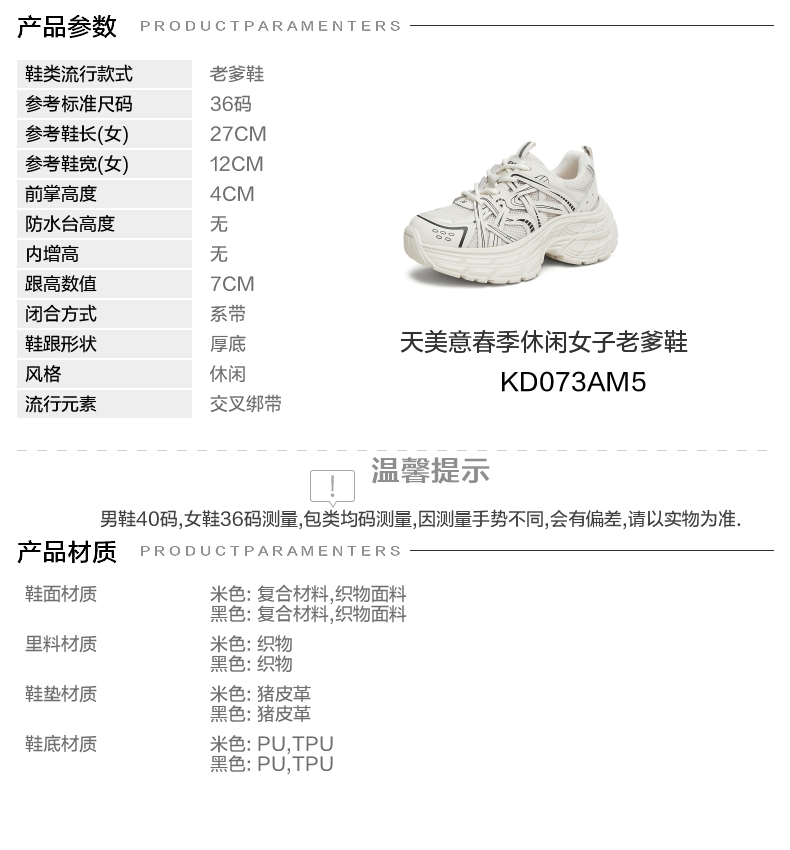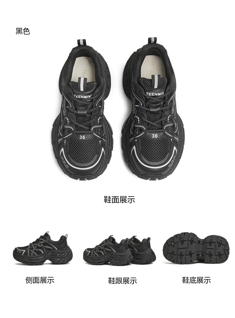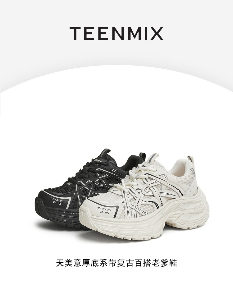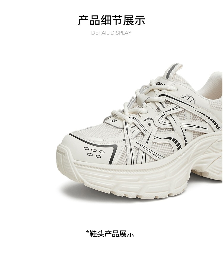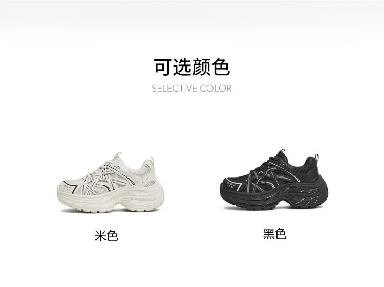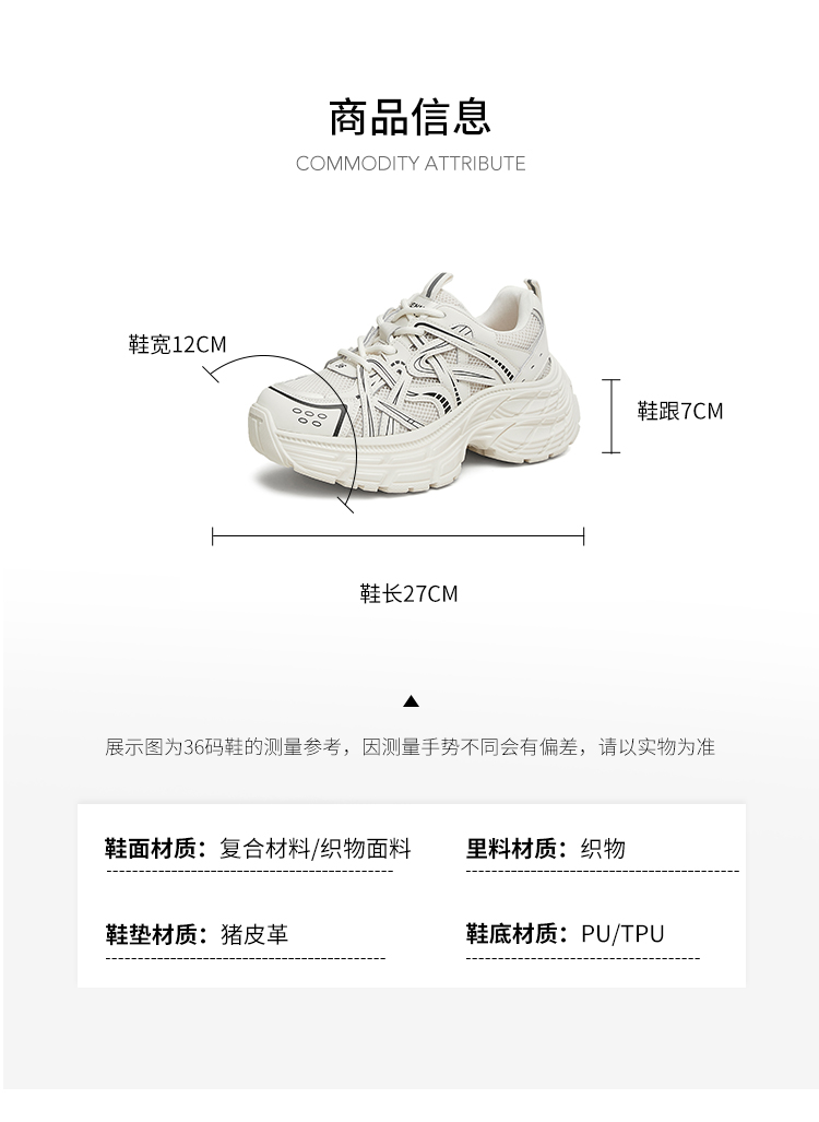 | 风格分类:老爹鞋 | 上市时间:2025年春季 | 鞋类流行款式:老爹鞋 | 鞋头款式:圆头 | 执行标准:旅游鞋GB/T15107-2013 |