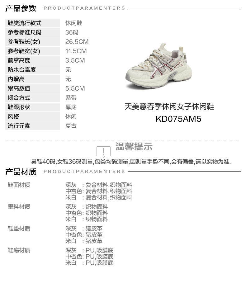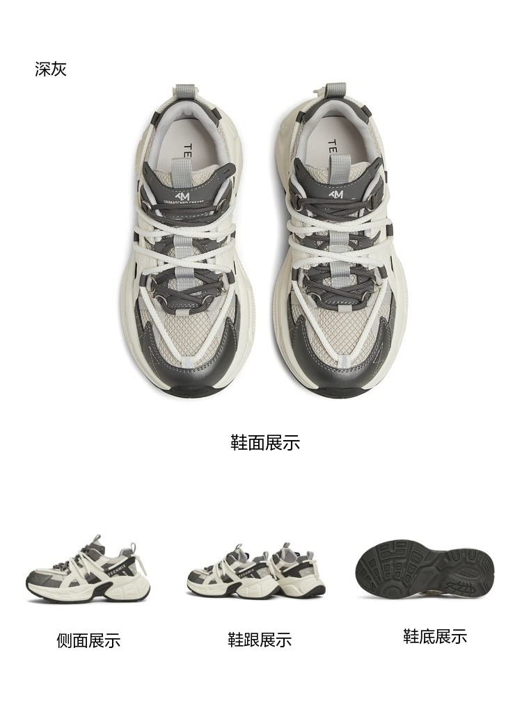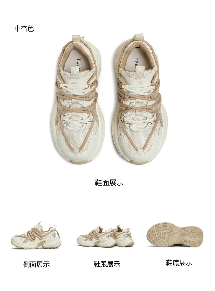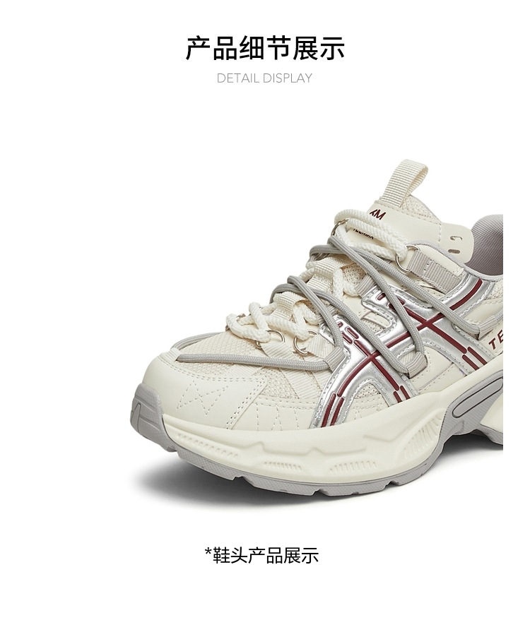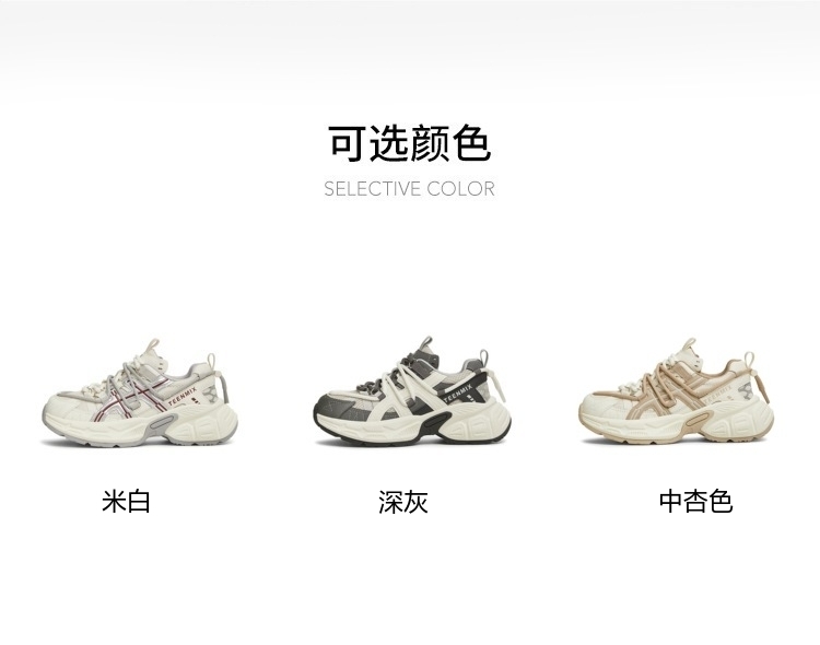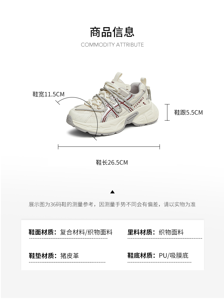 | 风格分类:老爹鞋 | 上市时间:2025年春季 | 鞋类流行款式:休闲鞋 | 鞋头款式:圆头 | 执行标准:舒适运动鞋Q/LR002-2023 |