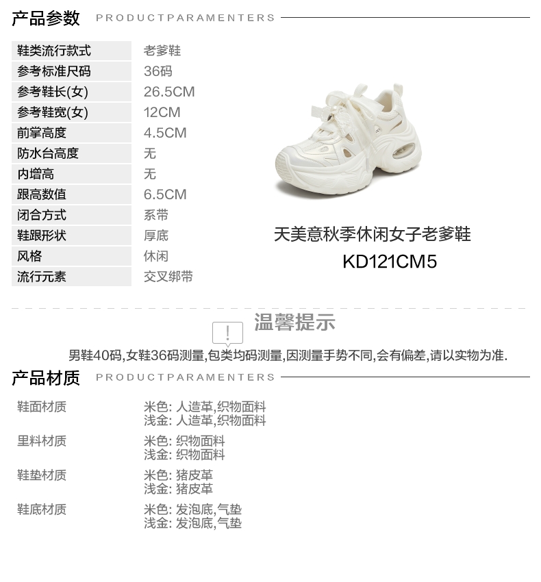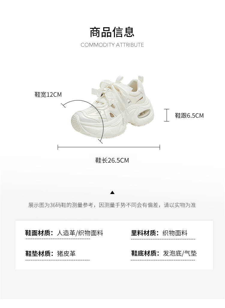 | 鞋垫材质:猪皮革 | 前掌高度:4.5CM | 皮质特征:人造革 | 鞋类流行款式:老爹鞋 |