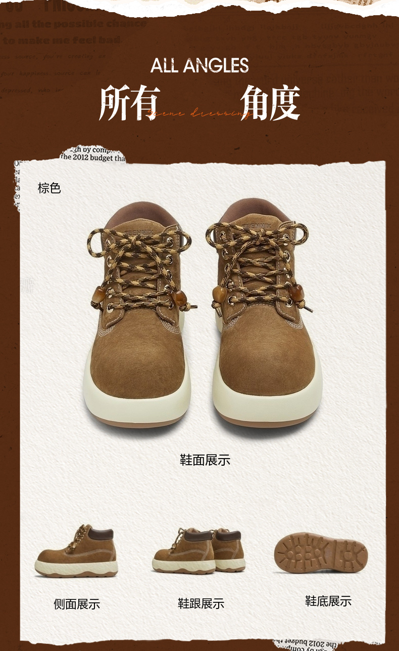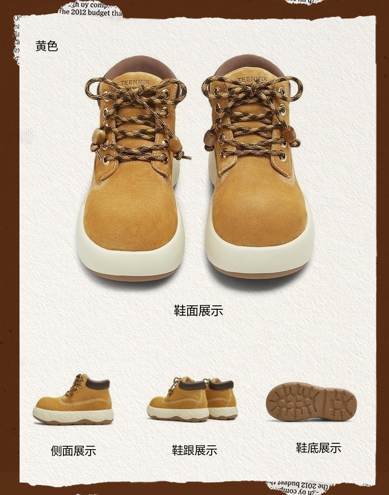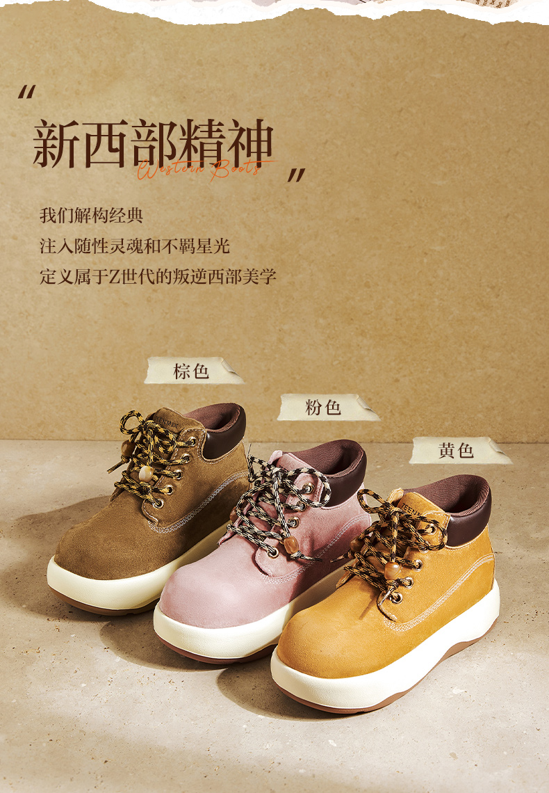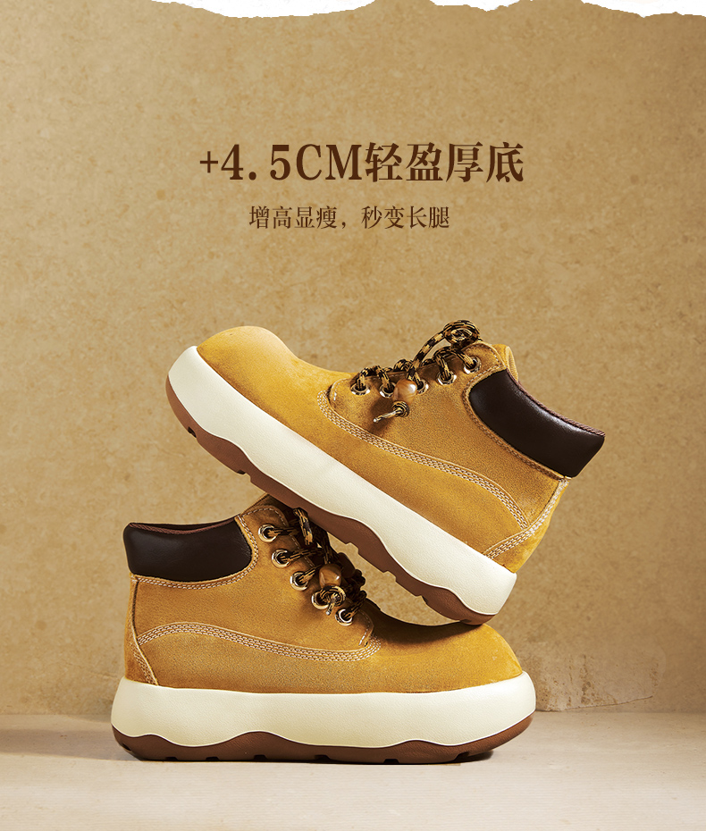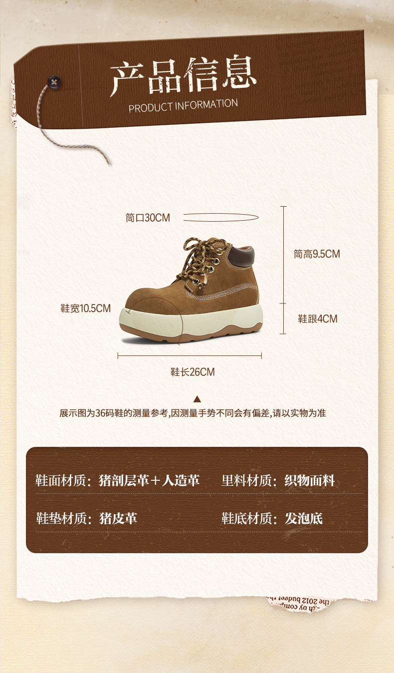 | 鞋底材质:发泡底 | 靴筒内里材质:织物面料 | 内增高:无 | 鞋面材质:人造革猪剖层革 | 闭合方式:系带 |