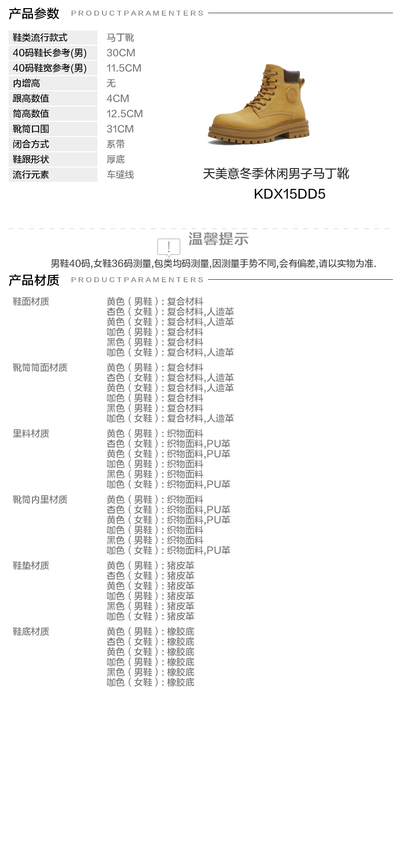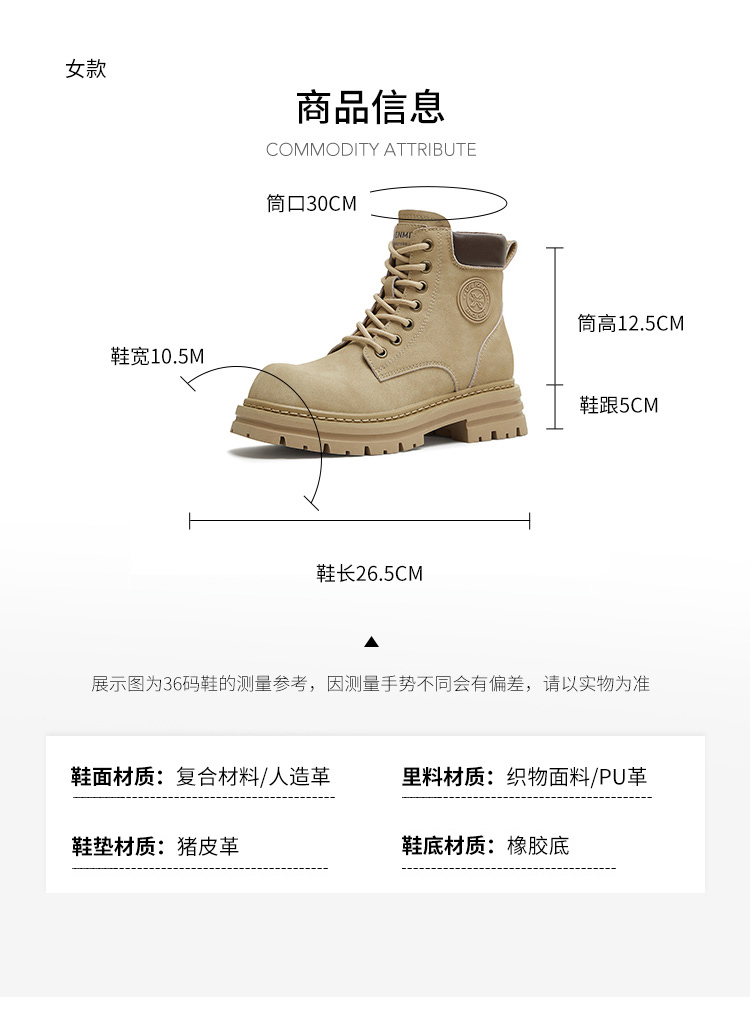 | 闭合方式:系带 | 40码鞋宽参考(男):11.5CM | 靴筒口围:31CM | 上市时间:2025年冬季 | 鞋类流行款式:马丁靴 |