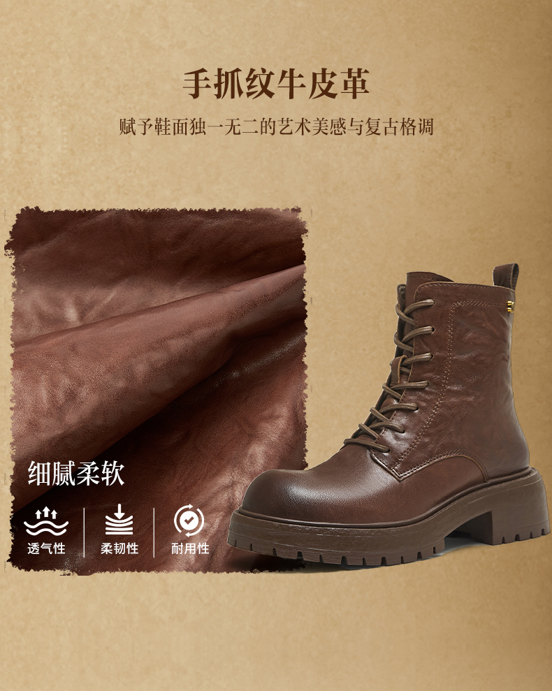 | 鞋底材质:TPR | 靴筒内里材质:人造革织物面料 | 内增高:无 | 鞋面材质:牛皮革 | 闭合方式:系带 |