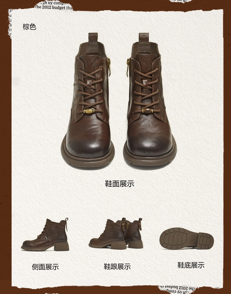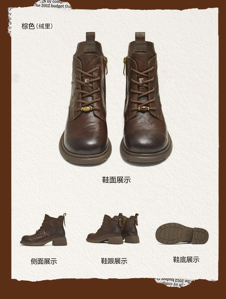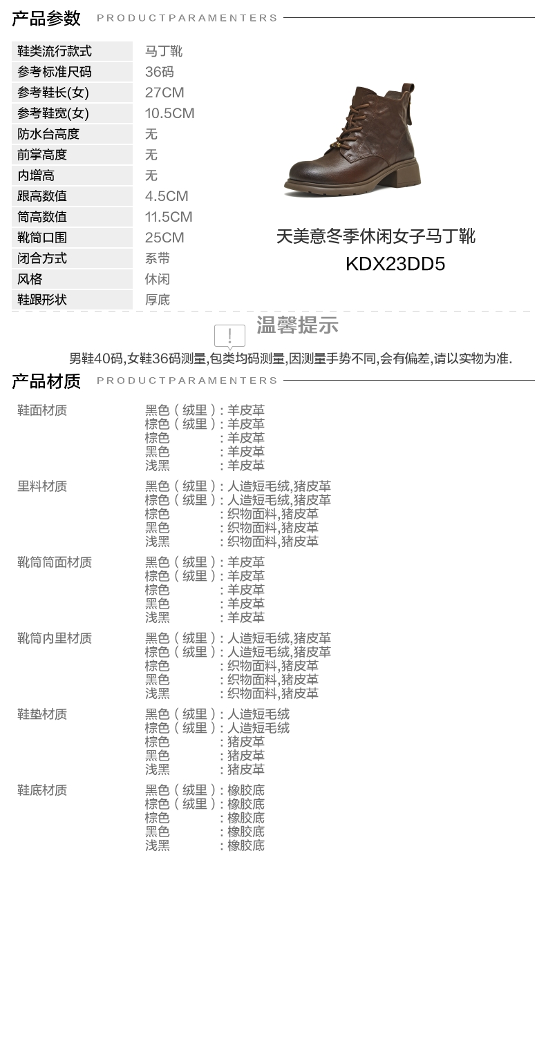 | 参考鞋宽(女):10.5CM | 风格:休闲 | 色系:棕色 | 跟高数值:4.5CM | 筒高数值:11.5CM |