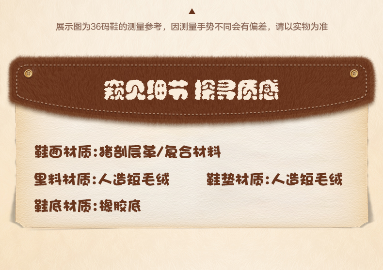 | 鞋垫材质:人造短毛绒 | 款式季节:冬季 | 前掌高度:2CM | 皮质特征:二层皮 | 防水台高度:无 |