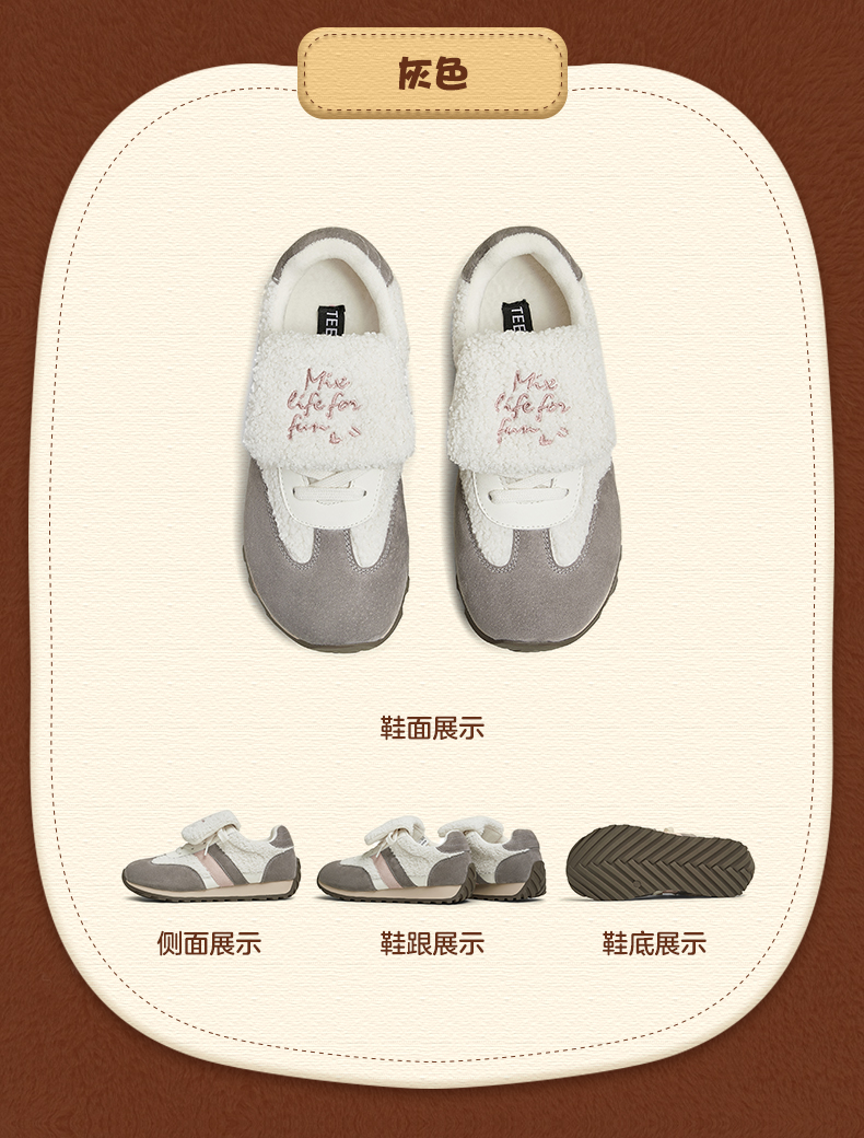 | 色系:灰色 | 跟高数值:3CM | 性别:女子 | 里料材质:人造短毛绒 | 制鞋工艺:胶贴皮鞋 |