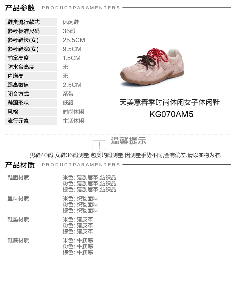 | 参考鞋宽(女):9.5CM | 风格:时尚休闲 | 年份:2025年 | 色系:粉色 | 参考标准尺码:36码 |