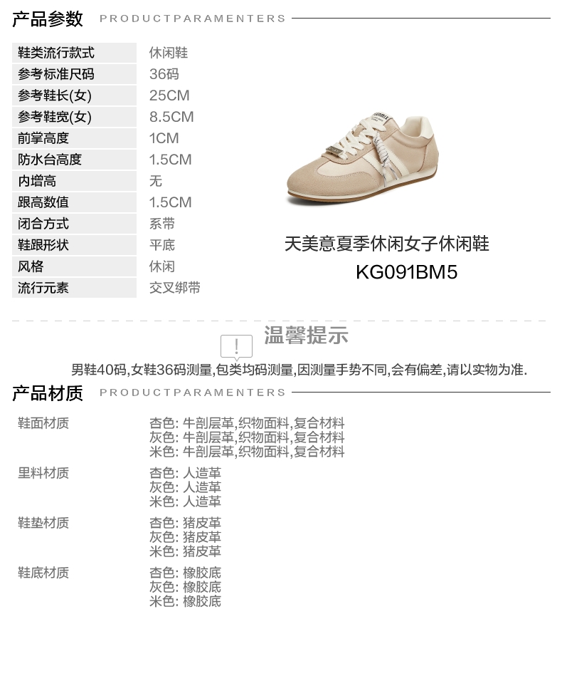 | 参考鞋宽(女):8.5CM | 风格:休闲 | 年份:2025年 | 色系:杏色 | 参考标准尺码:36码 |