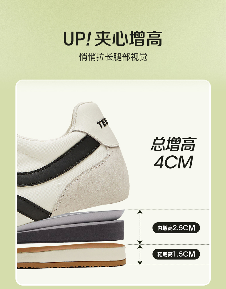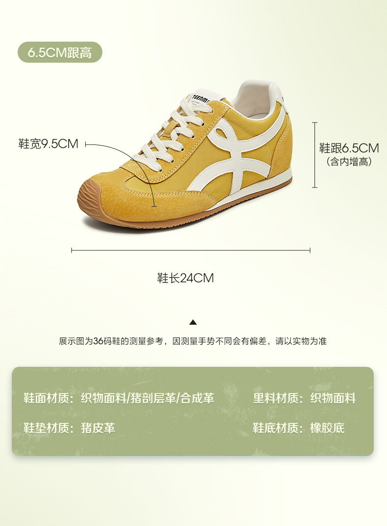 | 鞋帮:低帮 | 鞋底材质:橡胶底 | 内增高:2.5CM | 鞋面材质:织物面料合成革猪剖层革 | 闭合方式:系带 |