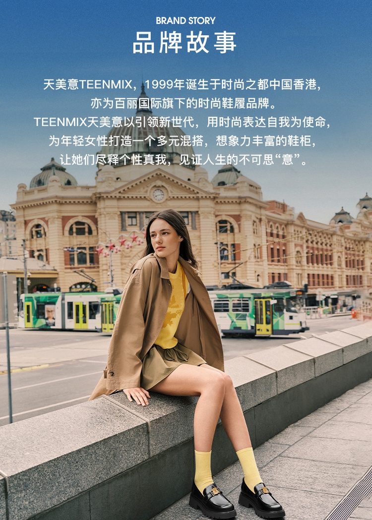 Teenmix(天美意),作为一个都市时尚休闲品牌,倡导“life for fun ,style for teens”即 “人生追求情趣,年轻追求个性”的生活品位,迎合都市年轻人不拘一格,追求mix&match自由组合,创出自我风格的潮流理念。Teenmix向人们展示了流行的转变,强调创意与个性,“teen”代表一群张扬个性、散发活力、追求都市炫彩生活的新新人群;“ mix”即mix&match,代表时尚混搭精神,品牌为年轻人提供恍如贴身订造的时尚潮品,并因应时尚的转变而响应。“随我意,天美意”传达了品牌的主张与个性。