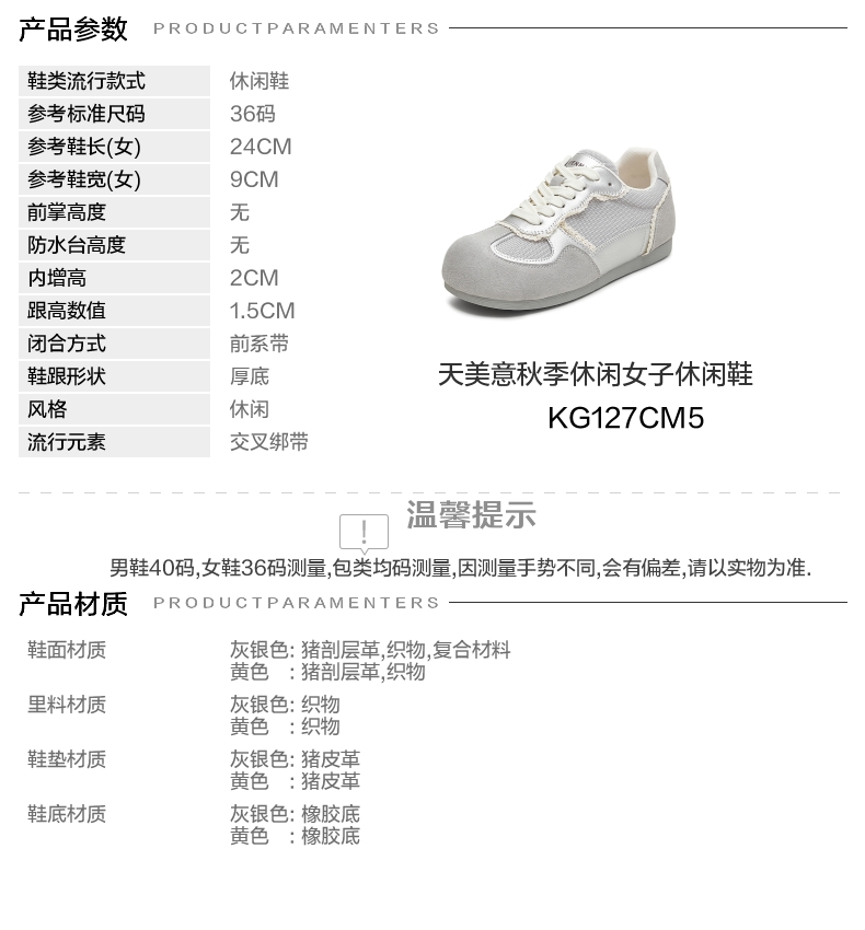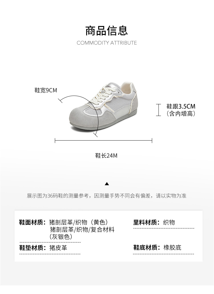 | 鞋帮:低帮 | 鞋底材质:橡胶底 | 内增高:2CM | 鞋面材质:复合材料织物猪剖层革 | 闭合方式:前系带 |