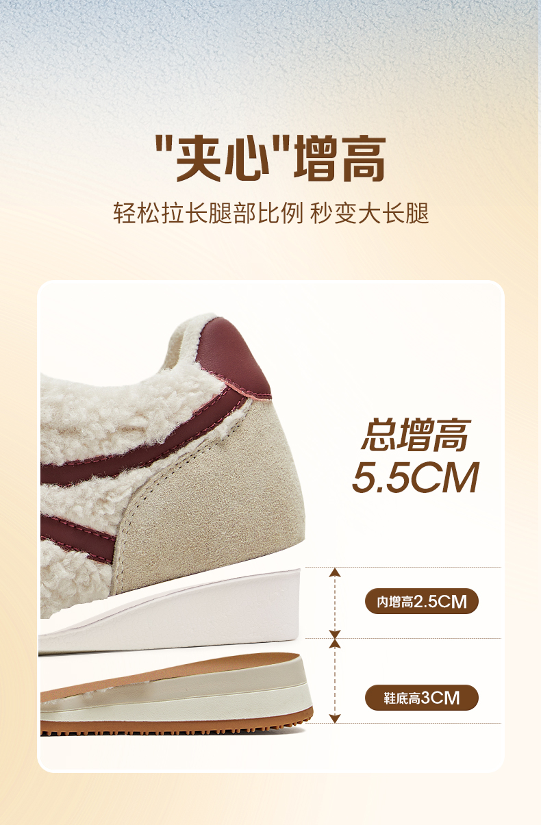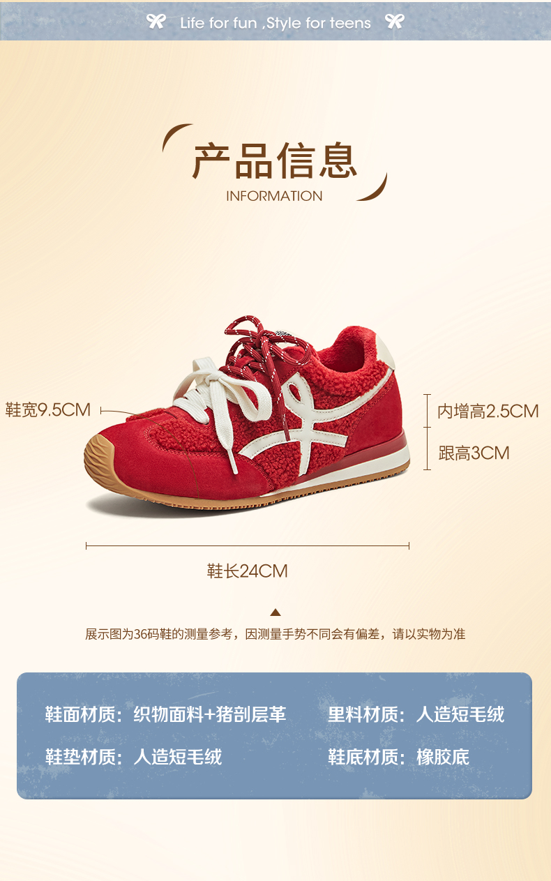 | 鞋帮:低帮 | 鞋底材质:橡胶底 | 内增高:2.5CM | 鞋面材质:猪剖层革织物面料 | 闭合方式:系带 |