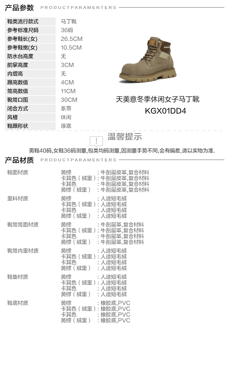 | 款式季节:冬季 | 前掌高度:3CM | 皮质特征:二层皮 | 防水台高度:无 |