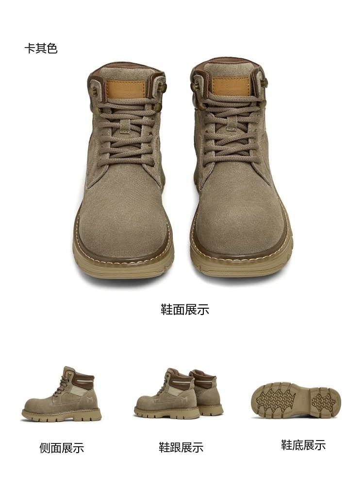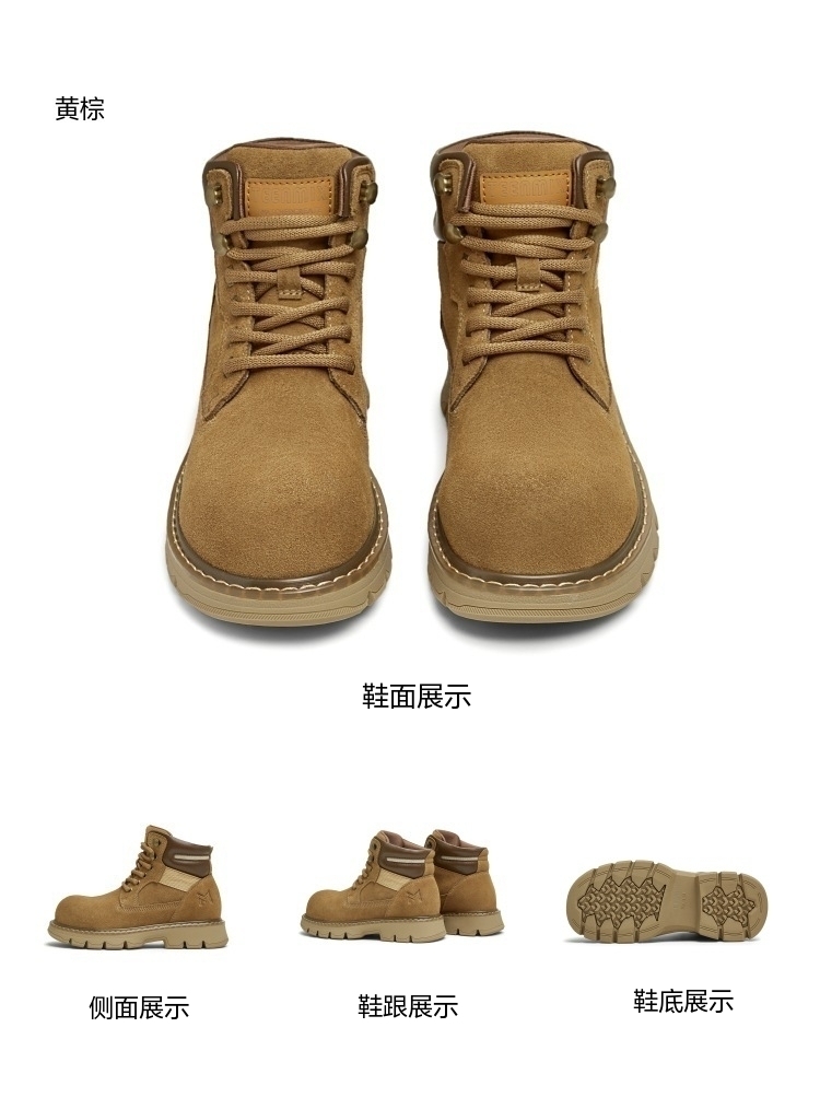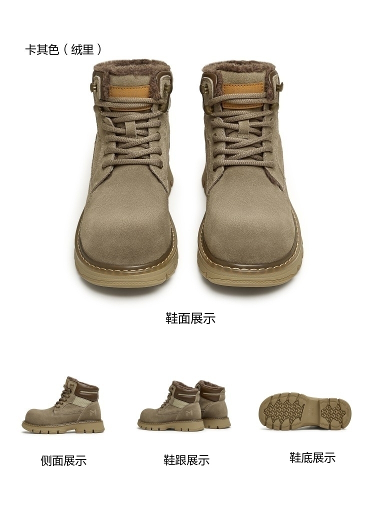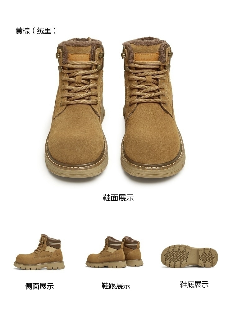 | 鞋底材质:PVC橡胶底 | 靴筒内里材质:人造短毛绒 | 内增高:无 | 鞋面材质:复合材料牛剖层皮革 | 闭合方式:系带 |