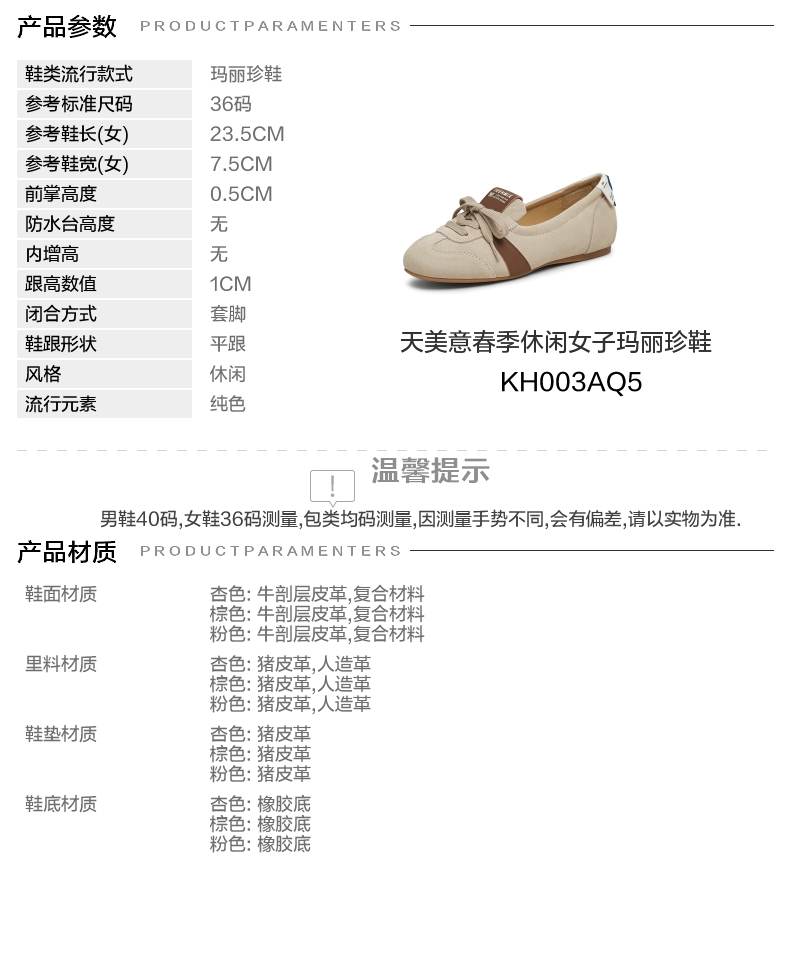 | 年份:2025年 | 色系:杏色 | 参考标准尺码:36码 | 跟高数值:1CM | 性别:女子 |