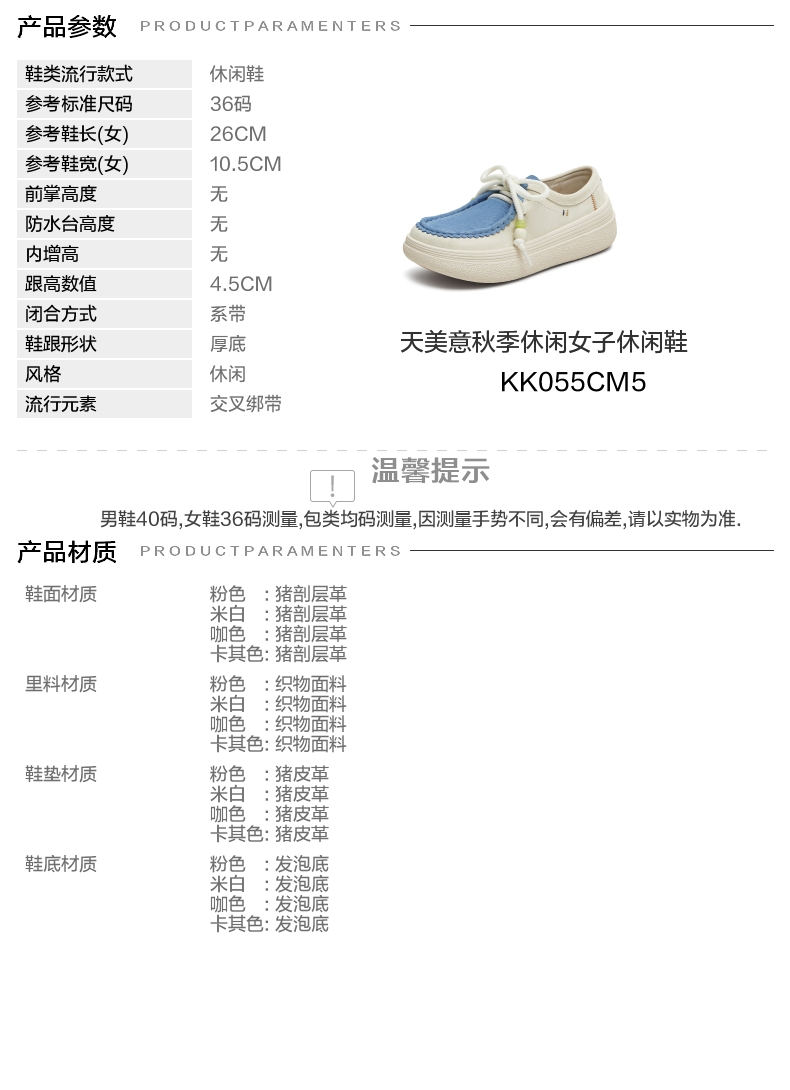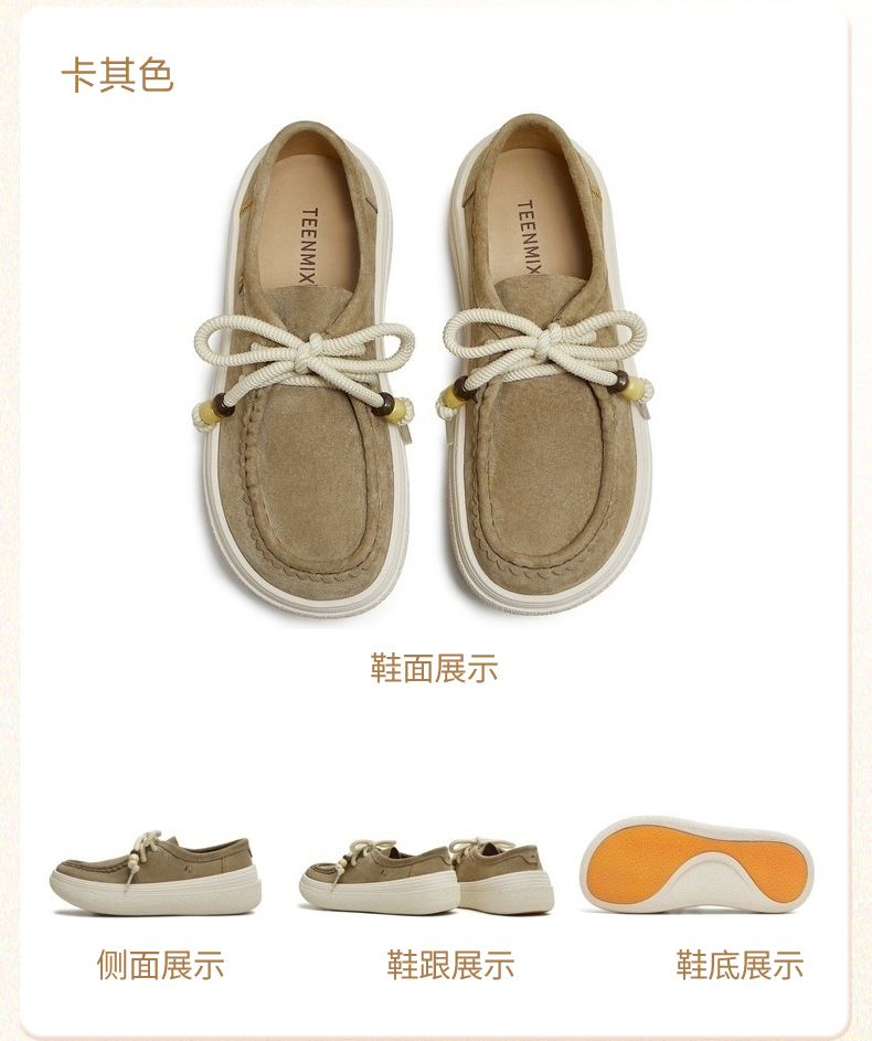 | 闭合方式:系带 | 风格:休闲 | 跟高数值:4.5CM | 色系:米白 | 配跟:无 |
