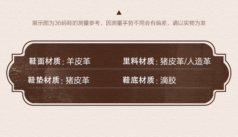 | 款式季节:春季 | 鞋垫材质:猪皮革 | 渠道划分:电商专销 | 前掌高度:0.5CM | 皮质特征:羊皮革 |