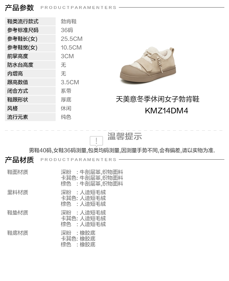 | 色系:卡其 | 参考标准尺码:36码 | 跟高数值:3.5CM | 性别:女子 | 里料材质:人造短毛绒 |