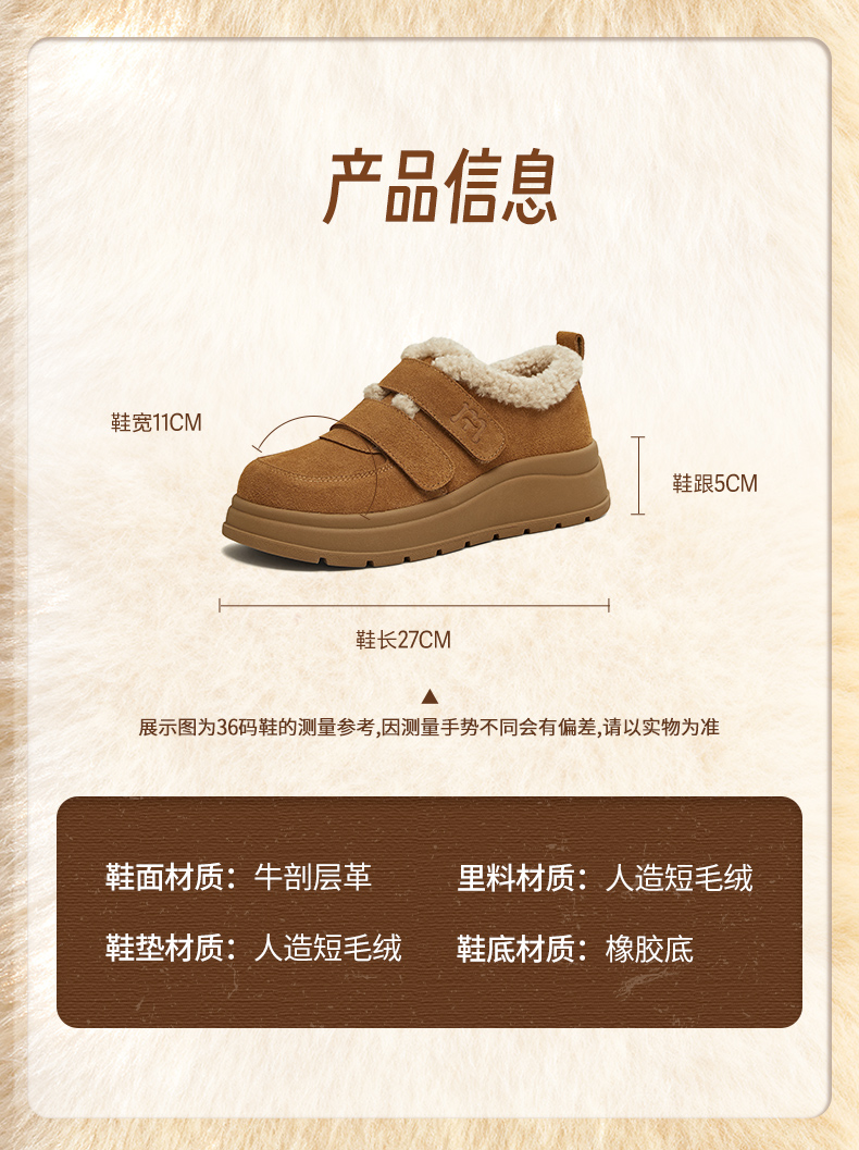 | 闭合方式:魔术贴 | 配跟:无 | 靴筒口围:22CM | 上市时间:2025年冬季 | 鞋类流行款式:单鞋 |