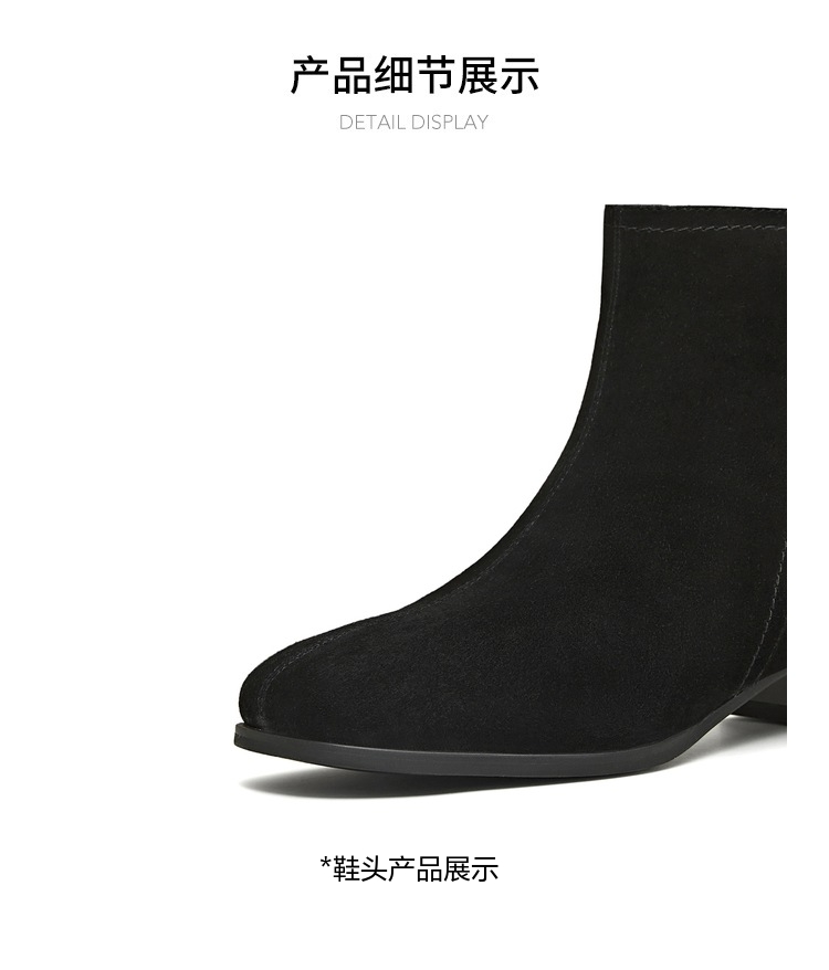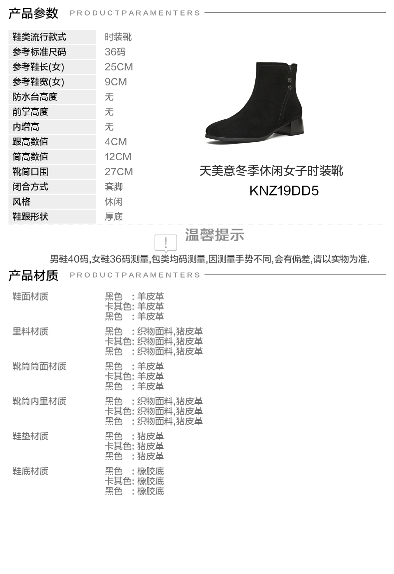 | 筒高数值:12CM | 靴筒筒面材质:羊皮革 | 里料材质:猪皮革织物面料 | 制鞋工艺:胶贴皮鞋 | 鞋垫材质:猪皮革 |