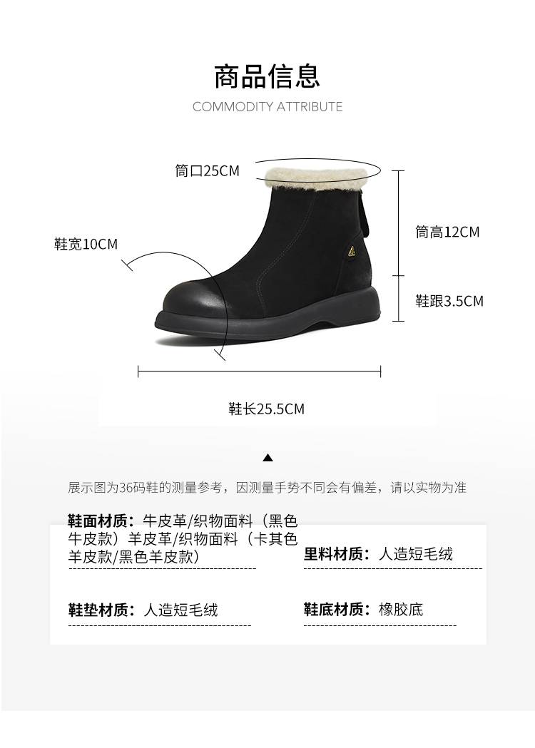 | 筒高数值:12CM | 靴筒筒面材质:织物面料牛皮革 | 里料材质:人造短毛绒 | 制鞋工艺:胶贴皮鞋 | 鞋垫材质:人造短毛绒 |