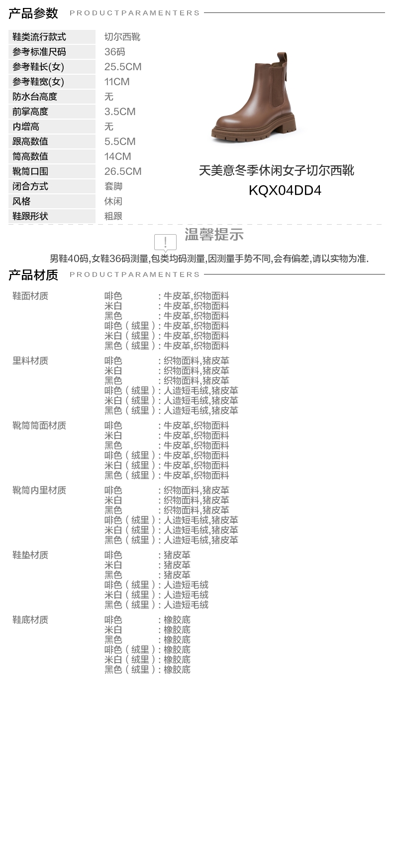 | 参考标准尺码:36码 | 跟高数值:5.5CM | 筒高数值:14CM | 性别:女子 | 靴筒筒面材质:牛皮革织物面料 |