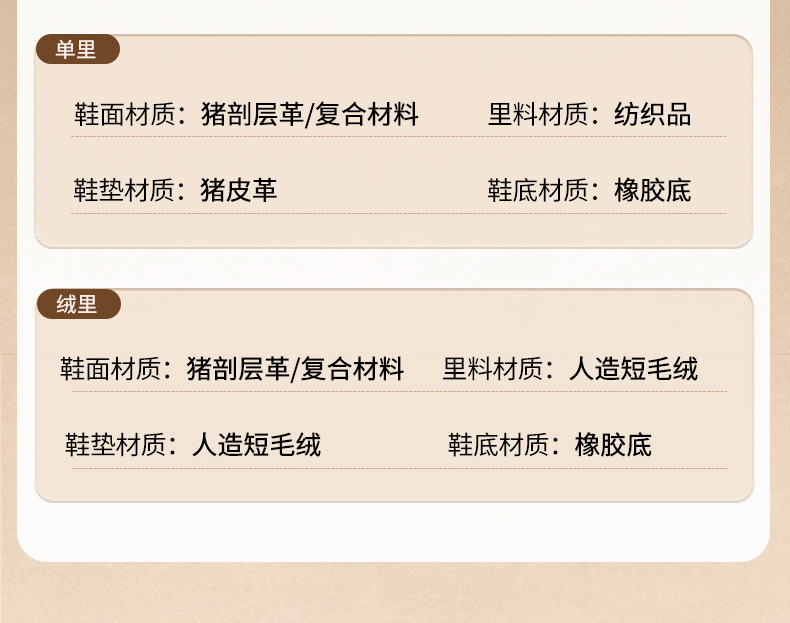 | 靴筒筒面材质:复合材料猪剖层皮革 | 里料材质:织物面料 | 制鞋工艺:胶贴皮鞋 | 鞋垫材质:猪皮革 | 款式季节:冬季 |
