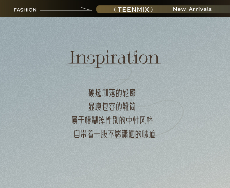 Teenmix(天美意),作为一个都市时尚休闲品牌,倡导“life for fun ,style for teens”即 “人生追求情趣,年轻追求个性”的生活品位,迎合都市年轻人不拘一格,追求mix&match自由组合,创出自我风格的潮流理念。Teenmix向人们展示了流行的转变,强调创意与个性,“teen”代表一群张扬个性、散发活力、追求都市炫彩生活的新新人群;“ mix”即mix&match,代表时尚混搭精神,品牌为年轻人提供恍如贴身订造的时尚潮品,并因应时尚的转变而响应。“随我意,天美意”传达了品牌的主张与个性。